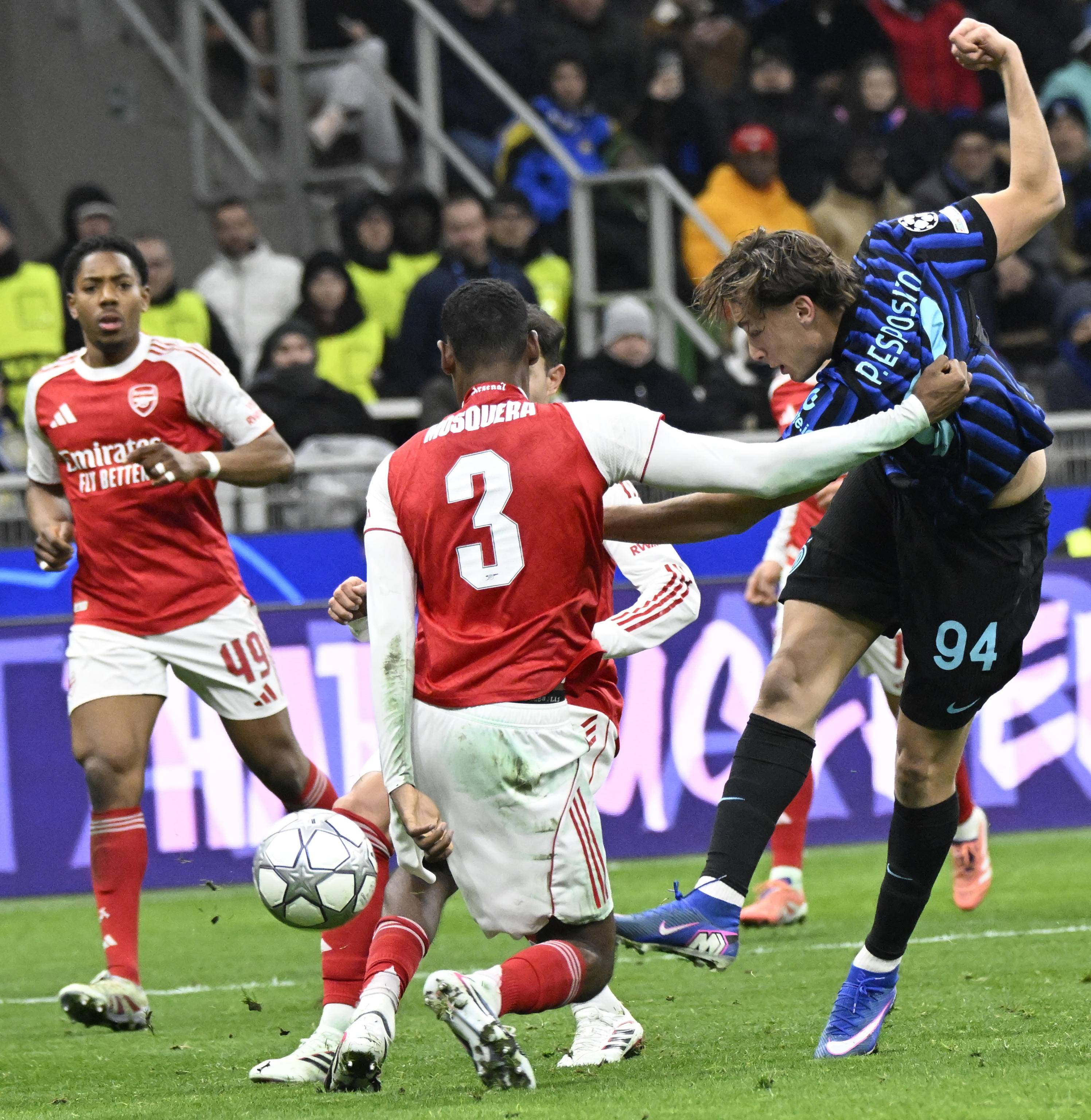 เมื่อวันที่ 20 มกราคม มอสเกราของอาร์เซนอล (กลาง) เข้าปะทะกับเอสปอสซิโต้ของอินเตอร์ มิลาน เพื่อแย่งบอล. ซีเอ็นเอ็น/อีพีเอ