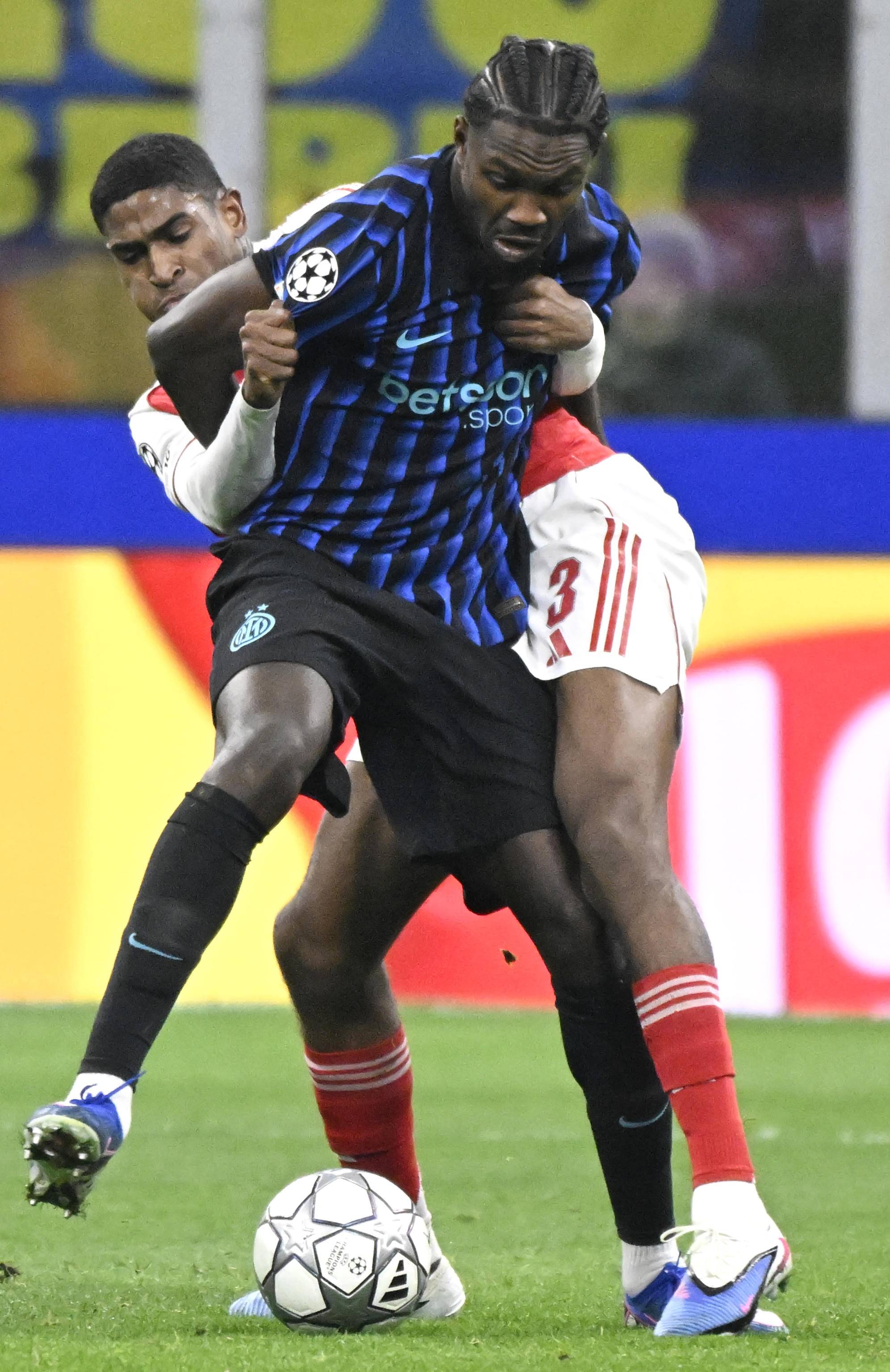 เมื่อวันที่ 20 มกราคม วิลเลียม ซาลิบา ของอาร์เซนอล (ซ้าย) เข้าปะทะกับเลาตาโร่ มาร์ติเนซ ของอินเตอร์ มิลาน (กลาง) เพื่อแย่งบอล. ซินหัว/อีพีเอ