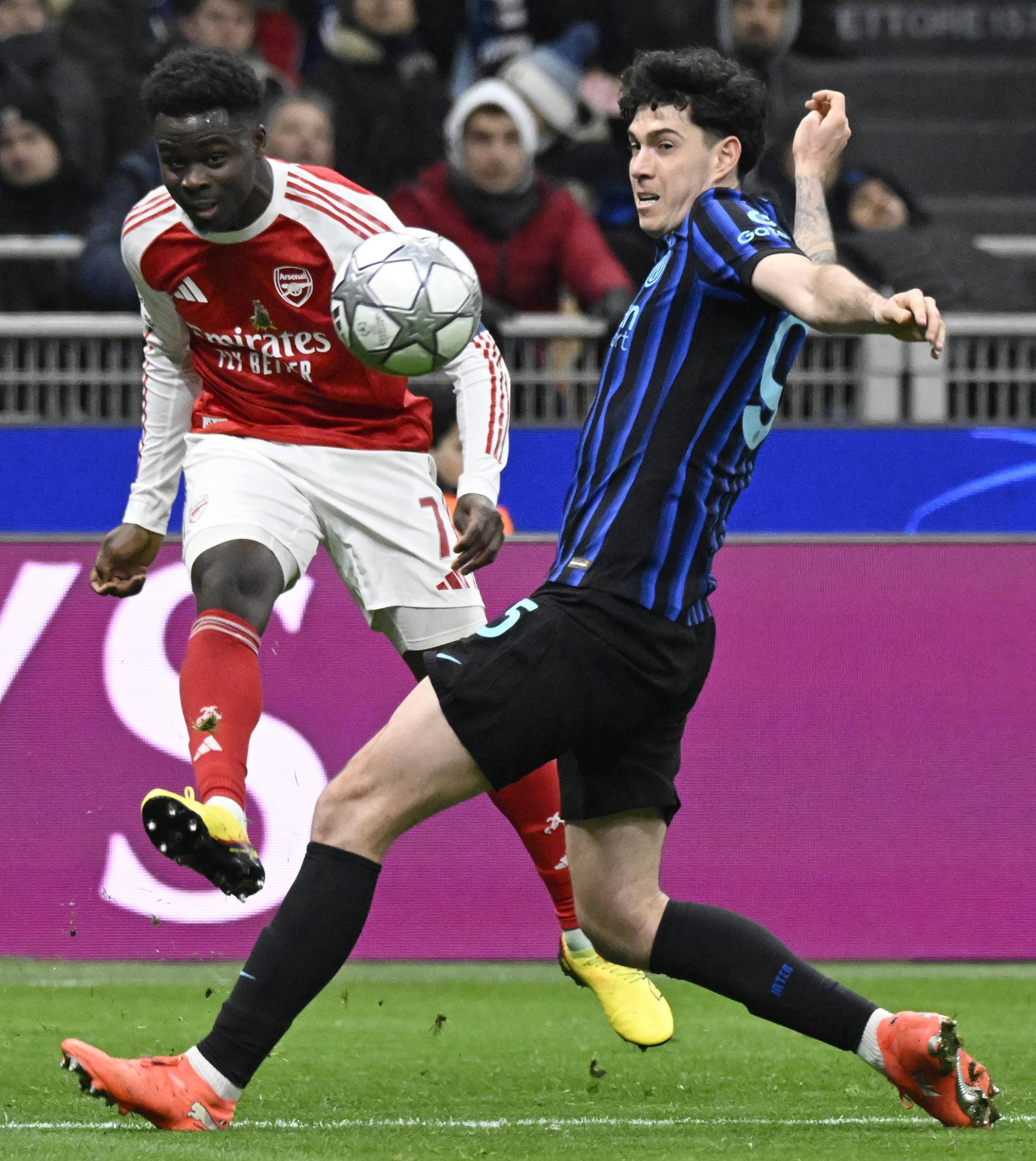 เมื่อวันที่ 20 มกราคม เอเซ่ของอาร์เซนอล (ขวา) เข้าปะทะกับซูคิชของอินเตอร์ มิลาน เพื่อแย่งบอล. ซีเอ็นเอ/อีพีเอ