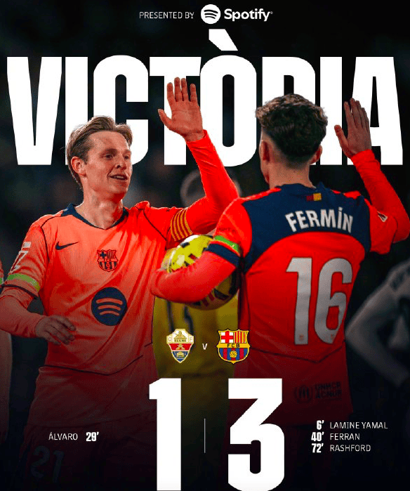 ในรอบที่ 22 ของลาลีกา บาร์เซโลนาคว้าชัยชนะ 3-1 จากเอลเช่ในเกมเยือน ขยายการนำเป็นสี่แต้มชั่วคราว ยามาลดาวรุ่งเปิดสกอร์ให้บาร์ซ่าและสร้างโอกาสหลายครั้ง ก่อนที่อัลบาโรจะเพิ่มสกอร์เป็นสองเท่าด้วยการจบสกอร์อย่างเยือกเย็น เฟอร์รานพลาดโอกาสทำประตูหลายครั้งแต่ก็ยังยิงเข้าได้ ขณะที่เฟร์มินมีโอกาสใกล้เคียงสองครั้ง แรชฟอร์ดพลาดโอกาสยิงเดี่ยวแต่สุดท้ายก็ทำประตูได้จากการซ้ำลูกยิง