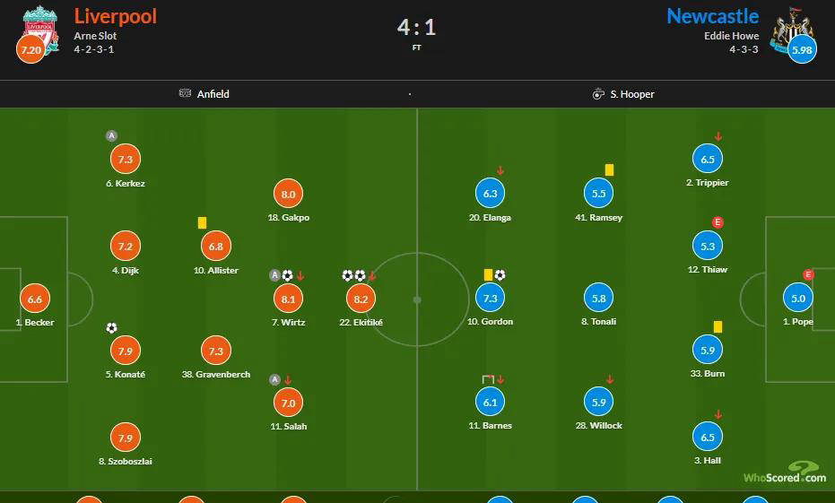ไฮไลท์การแข่งขัน: กอร์ดอนได้รับใบเหลืองจากการทำฟาวล์ต่ออลิสซอนในนาทีที่ 12; บาร์นส์ยิงชนเสาจากลูกฟรีคิกให้กับนิวคาสเซิลในนาทีที่ 26; ซาลาห์พลาดโอกาสยิงเดี่ยวในนาทีที่ 69 ผู้เล่นจากทั้งสองฝ่ายมีการปะทะกันอย่างดุเดือด สร้างช่วงเวลาที่น่าตื่นเต้นอย่างต่อเนื่องที่ทำให้ผู้ชมลุ้นจนแทบนั่งไม่ติดที่นั่ง