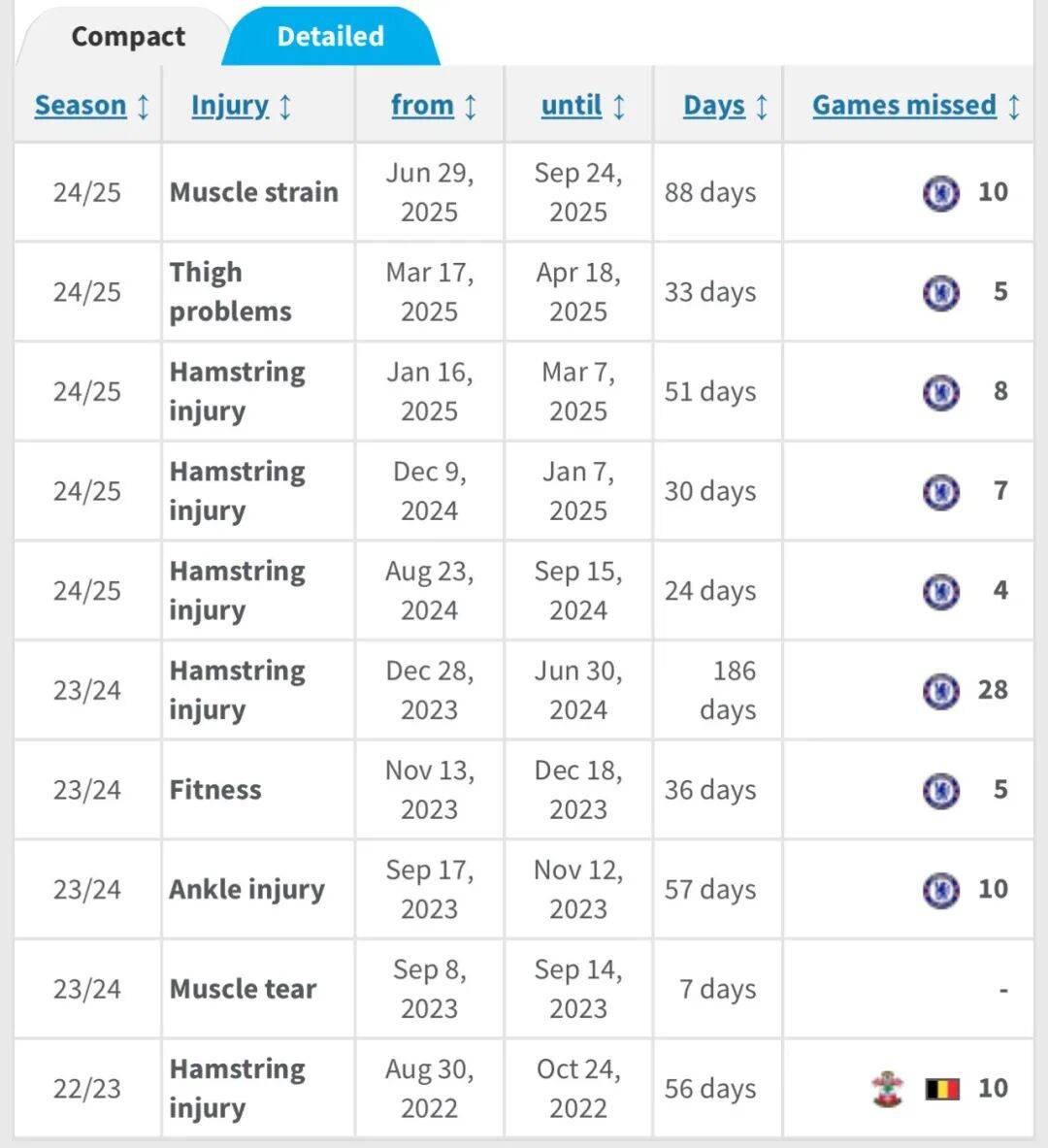 ผู้เล่นที่มีอาการบาดเจ็บมากที่สุดในพรีเมียร์ลีก! ในสองปีที่อยู่กับเชลซี เขาพลาดการแข่งขันไปเก้านัดเนื่องจากอาการบาดเจ็บ และไม่เคยลงเล่นครบ 90 นาทีเต็มเลย