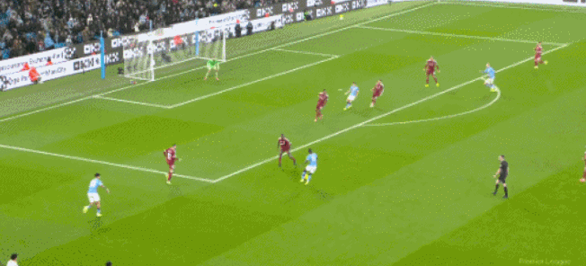 ในนาทีที่ 29 นูเนสเปิดบอลจากทางฝั่งขวา ฮาลันด์กระโดดสูงเหนือกองหลังและโหม่งบอลเข้าประตูอย่างทรงพลัง ทำลายความสมดุลและทำให้แมนเชสเตอร์ ซิตี้ขึ้นนำ 1-0