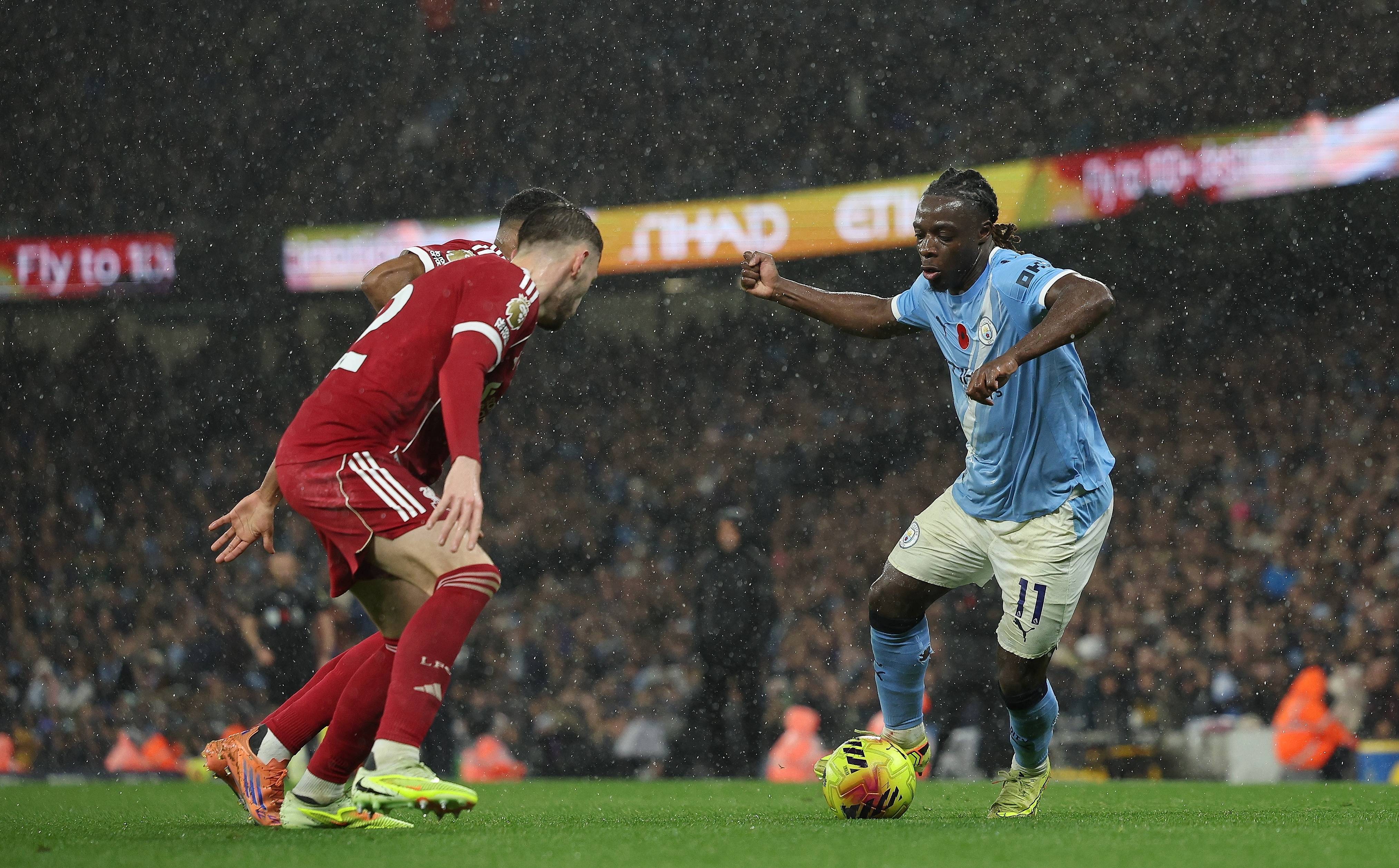 เมื่อวันที่ 9 พฤศจิกายน ด็อกู ของแมนเชสเตอร์ ซิตี้ (ขวา) ท้าทาย แบรดลีย์ ของลิเวอร์พูล เพื่อแย่งบอล. ซีเอ็นเอ็น/อีพีเอ