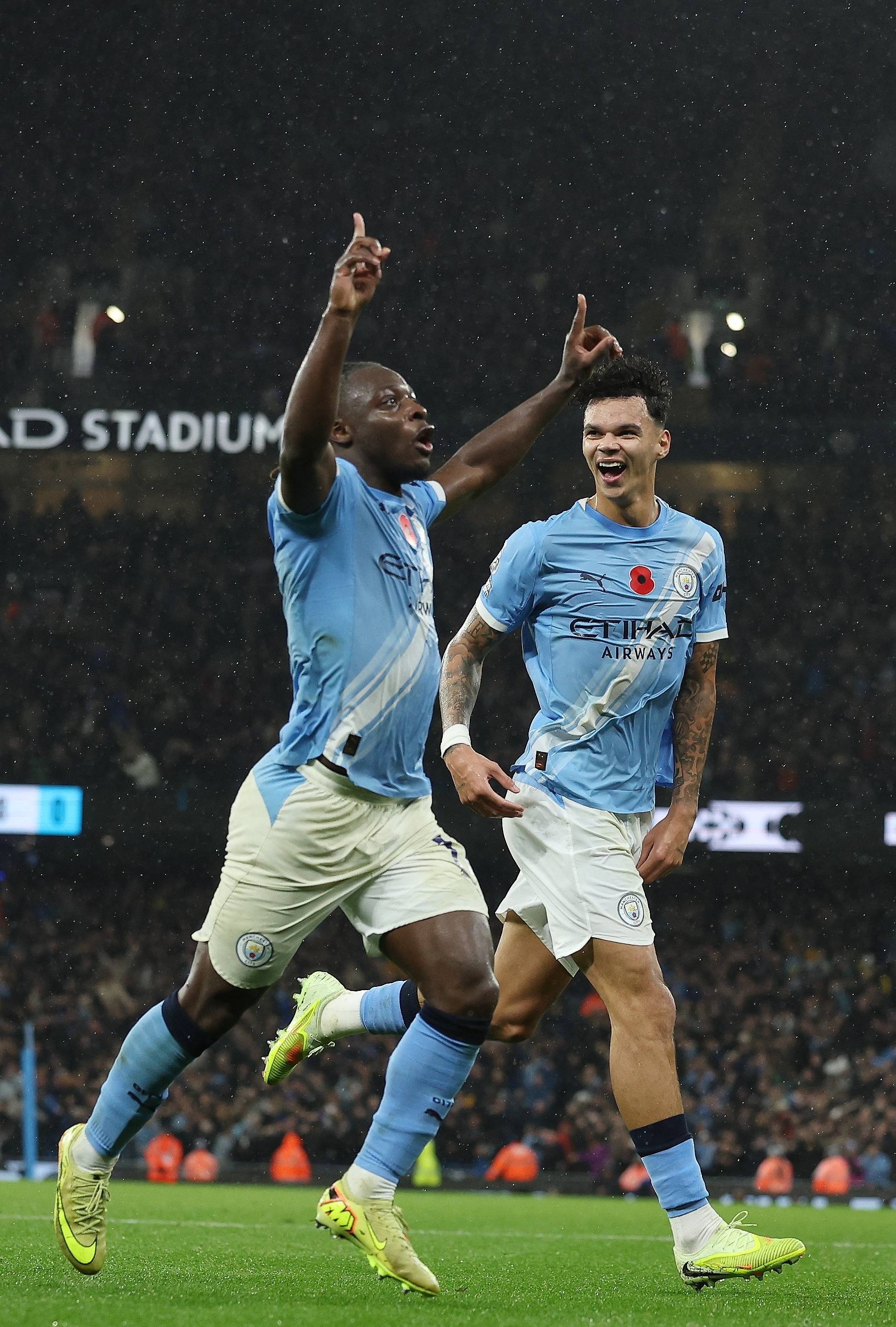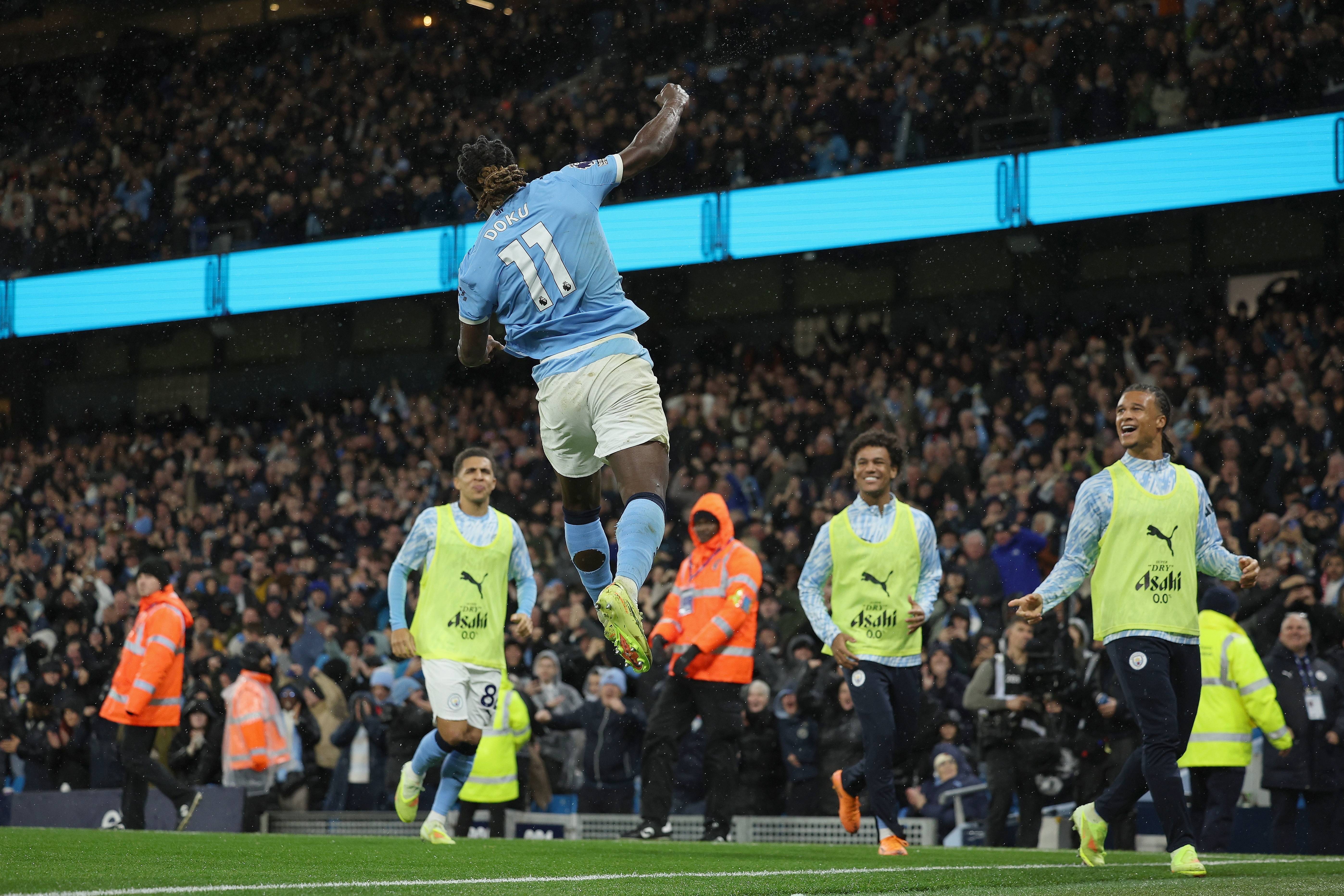 เมื่อวันที่ 9 พฤศจิกายน นักเตะแมนเชสเตอร์ ซิตี้ ดoku ฉลองการทำประตูที่สามของทีม. Xinhua/EPA