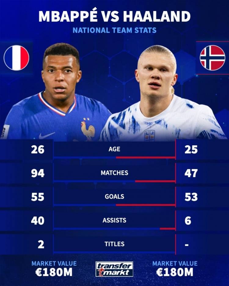 ตลอดสองทศวรรษที่ผ่านมา นักเตะที่มีทักษะการโจมตีที่น่าตื่นเต้นที่สุดในวงการฟุตบอลคือ ลิโอเนล เมสซี และคริสเตียโน โรนัลโด ในขณะที่กองหน้าที่โดดเด่นที่สุดของยุคปัจจุบันคือ 'คู่หูใหม่' คีเลียน เอ็มบัปเป้ และเออร์ลิง ฮาลันด์ เพื่อตอบสนองต่อสิ่งนี้ Transfermarkt ได้เผยแพร่กราฟิกเปรียบเทียบสถิติระดับนานาชาติของเมสซี & โรนัลโด กับ เอ็มบัปเป้ & ฮาลันด์