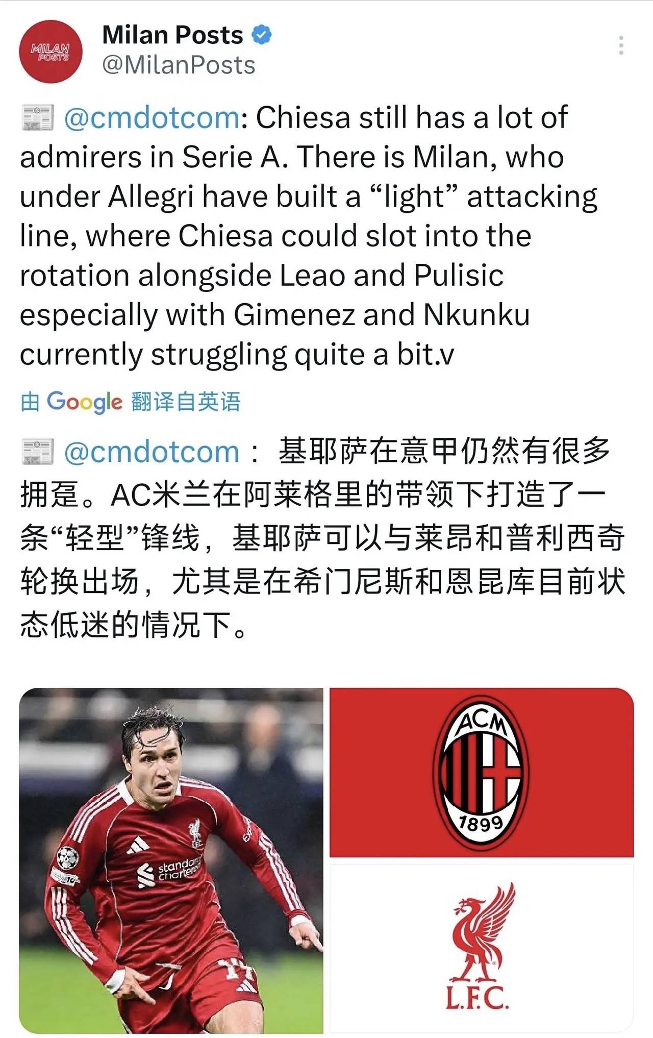 สื่ออิตาลีรายงาน: เอซี มิลาน ยังคงสนใจในตัว เฟเดริโก้ เคียซ่า ของลิเวอร์พูล และวางแผนที่จะนำเขากลับมาสู่เซเรีย อา ในช่วงตลาดซื้อขายนักเตะฤดูหนาว อัลเลกรี ปีก