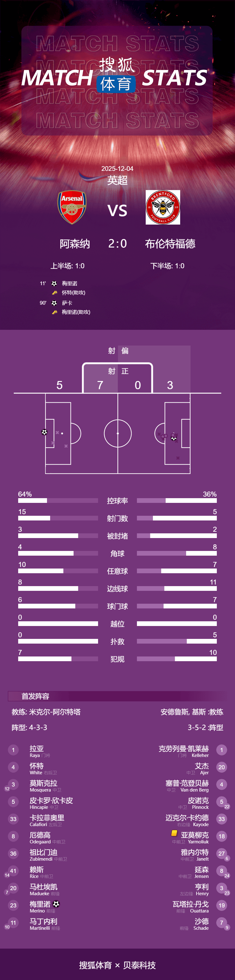 เวลา 03:30 น. ตามเวลาปักกิ่ง วันที่ 4 ธันวาคม อาร์เซนอลเปิดบ้านต้อนรับการมาเยือนของเบรนท์ฟอร์ด ในรอบที่ 14 ของฤดูกาลพรีเมียร์ลีก 2025-26ในครึ่งแรก เมรีโน่โหม่งทำประตูจากลูกตั้งเตะ ขณะที่โมสเกราต้องออกจากสนามเนื่องจากอาการบาดเจ็บในช่วงท้ายเกม หลังจากไรซ์ถอนตัวออกไปด้วยอาการบาดเจ็บ เมรีโน่ก็จ่ายบอลให้ซาก้าทำประตูในช่วงทดเวลาบาดเจ็บ อาร์เซนอลจึงคว้าชัยชนะ 2-0 ด้วยประตูละหนึ่งลูกในแต่ละครึ่ง ด้วยคะแนน 33 แต้มจาก 14 นัด พวกเขายังคงนำเป็นจ่าฝูงของตารางพรีเมียร์ลีกด้วยคะแนนนำ 5 แต้ม