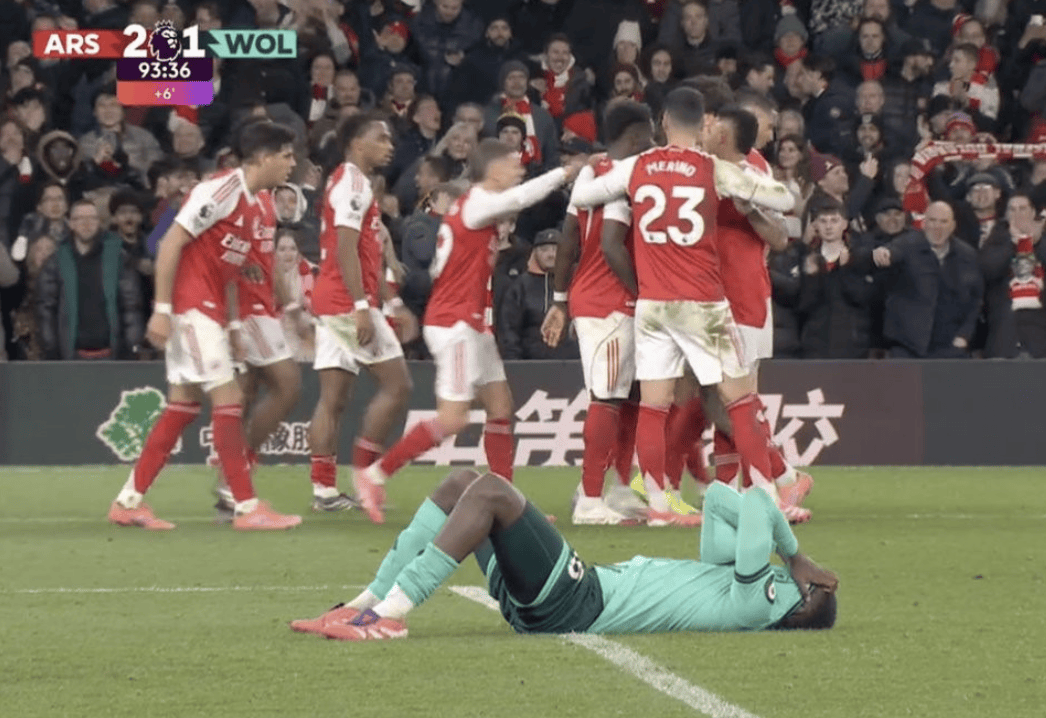 อย่างไรก็ตาม นักเตะของวูล์ฟส์ดูเหมือนจะไม่สามารถทนเห็นอาร์เซนอลทำแต้มหล่นได้ ในนาทีที่ 94 พวกเขา 'ใจดี' มอบประตูตัวเองอีกครั้ง ซาก้าเปิดบอลจากฝั่งขวา และกองหลังของวูล์ฟส์โหม่งสกัดออกไป – แต่กลับส่งบอลเข้าประตูตัวเอง ใช่แล้ว วูล์ฟส์ได้ปิดฉากความพ่ายแพ้ของตัวเอง! ขอบคุณสองประตูตัวเองจากคู่แข่ง อาร์เซนอลคว้าสามแต้มไปได้อย่างดราม่าที่สุด