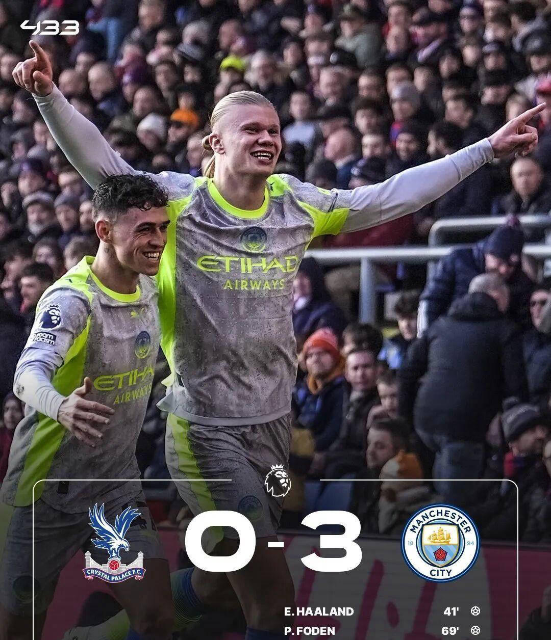 แมนเชสเตอร์ ซิตี้ ถล่มคริสตัล พาเลซ 3-0 โดยเออร์ลิง ฮาแลนด์ ทำประตูได้สองครั้ง ทำให้ยอดรวมในพรีเมียร์ลีกของเขาเป็น 102 ประตู ซึ่งห่างจากสถิติของคริสเตียโน โรนัลโดเพียงหนึ่งประตู การทำแอสซิสต์และการยิงจุดโทษของนักเตะกองหน้ารายนี้แสดงให้เห็นถึงสัญชาตญาณนักล่าของเขา ซึ่งยังคงฟอร์มที่ยอดเยี่ยมและขยายสถิติการทำประตูที่น่าทึ่งของเขาต่อไป