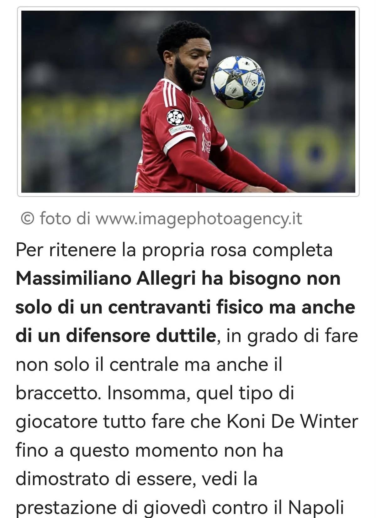 เพื่อเสริมทัพให้สมบูรณ์ มัสซิมิเลียโน่ อัลเลกรี ต้องการไม่เพียงแค่กองหน้าตัวเป้าที่มีรูปร่างแข็งแกร่งเท่านั้น แต่ยังต้องการผู้เล่นสารพัดประโยชน์ที่สามารถเล่นได้ทั้งตำแหน่งเซ็นเตอร์แบ็กและตำแหน่งอื่น ๆ ได้อีกด้วย กล่าวโดยสรุป เขาต้องการผู้เล่นที่เล่นได้หลายตำแหน่ง และคอนอร์ เดวินเตอร์ ยังไม่ได้แสดงให้เห็นถึงคุณสมบัติเช่นนั้น ดังที่เห็นได้จากผลงานของเขาในศึกซูเปอร์คัพเมื่อวันพฤหัสบดีที่ผ่านมาที่พบกับนาโปลี