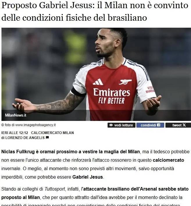 พระเยซู! มิลานปฏิเสธพระเยซู กองหน้าของอาร์เซนอลเคยเป็นผู้เล่นที่มิลานให้ความสนใจมาก่อน ซึ่งเคยมีข่าวว่าพวกเขาสนใจในตัวเขา อย่างไรก็ตาม นั่นเป็นเรื่องนานมาแล้ว มิลานในปัจจุบันไม่ไว้วางใจพระเยซู และสภาพร่างกายของเขาก็เป็นที่น่ากังวล แม้ว่าทั้งพระเยซูและอาร์เซนอลจะยินดีที่จะเปิดการเจรจากับมิลาน แต่สโมสรได้ปฏิเสธการเคลื่อนไหวดังกล่าว