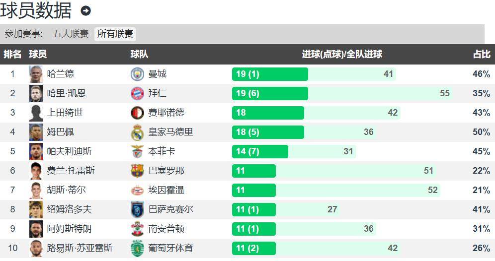 - 并列第一:哈兰德,曼城/英超,19球,系数2,38分。