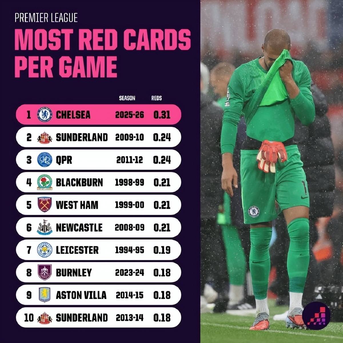 หลังจากคว้าชัยชนะในฟีฟ่า คลับ เวิลด์คัพ เชลซีเข้าสู่ฤดูกาลใหม่ด้วยความคาดหวังสูง แต่กลับพบว่าตัวเองติดกับดักใบแดง ใน 13 นัดแรกของพรีเมียร์ลีก พวกเขาสะสมใบแดงไปแล้ว 4 ใบ (เฉลี่ย 0.31 ใบต่อเกม) หากอัตราการใบแดงนี้ยังคงอยู่ต่อไป อาจสร้างสถิติใหม่ในพรีเมียร์ลีกได้