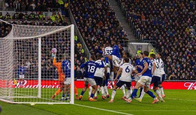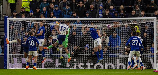 ↑ ผู้เล่นเอฟเวอร์ตัน โอไบรอัน (ซ้ายบน) ทำประตูด้วยการโหม่ง แต่ประตูถูกตัดสินให้เป็นประตูไม่ได้ในภายหลัง