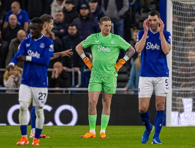 จอร์แดน พิคฟอร์ด ผู้รักษาประตูของเอฟเวอร์ตัน (กลาง) ดูเศร้าหมองหลังจากท็อตแน่มทำประตูได้