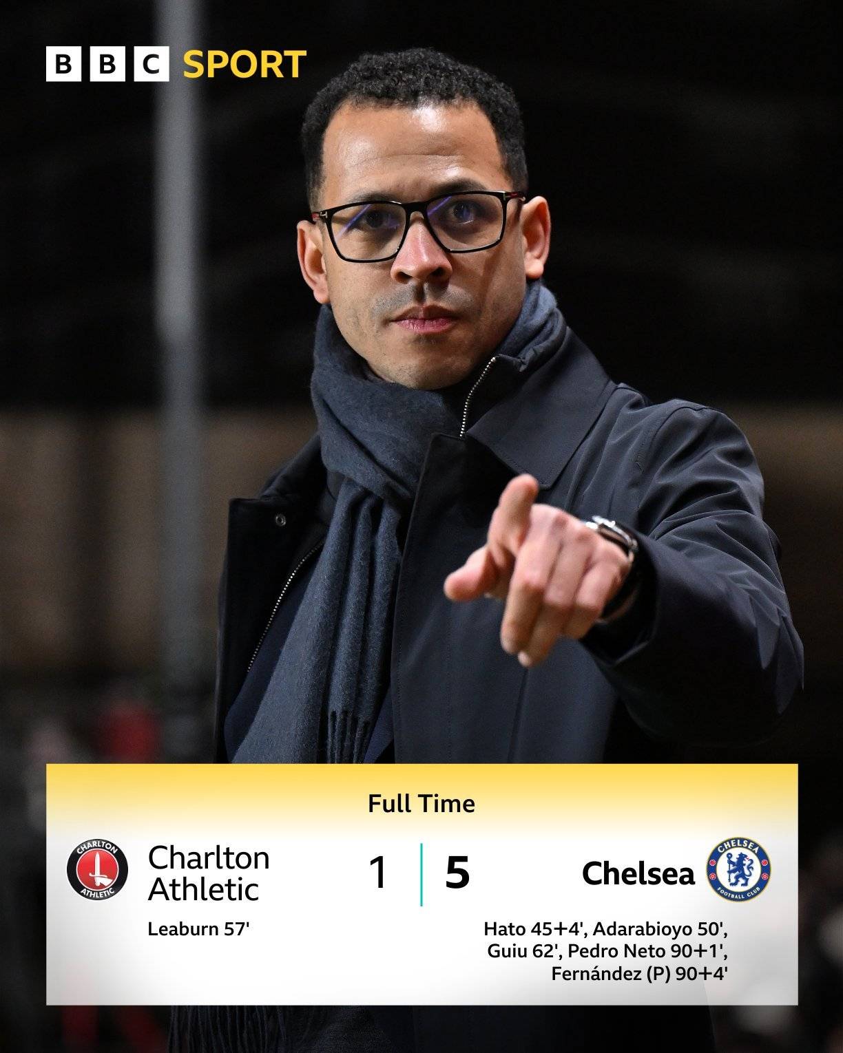 เชลซีทำประตูอีกครั้งในนาทีที่ 62 โบนาน็อตเต้ยิงไกลแต่บอลถูกปัดออกมา แต่กิอูอิฉวยโอกาสซ้ำเข้าไปตุงตาข่าย เชลซีเปลี่ยนตัวผู้เล่นหลายราย โดยส่งเอสเตบันลงมาก่อน ตามด้วยเอนโซ่ เฟร์นานเดซ และเดลาป ในช่วงทดเวลาบาดเจ็บ เชลซียิงเพิ่มอีกสองประตูเนโต้และเอนโซ่ เฟร์นันเดซ ต่างทำประตูได้คนละหนึ่งลูกเพื่อปิดฉากชัยชนะ สกอร์สุดท้ายอยู่ที่ 5-1 เชลซีเอาชนะชาร์ลตัน แอธเลติก
