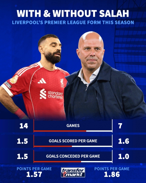 ที่น่าสนใจคือ เมื่อเปรียบเทียบกันแล้ว ในทุกนัดที่ซาลาห์ลงสนามในพรีเมียร์ลีกฤดูกาลนี้ (14 นัด: ชนะ 7 นัด, เสมอ 1 นัด, แพ้ 6 นัด) ลิเวอร์พูลสามารถเก็บได้เพียง 1 คะแนนจากการเสมอ และต้องพบกับความพ่ายแพ้ถึง 6 นัด