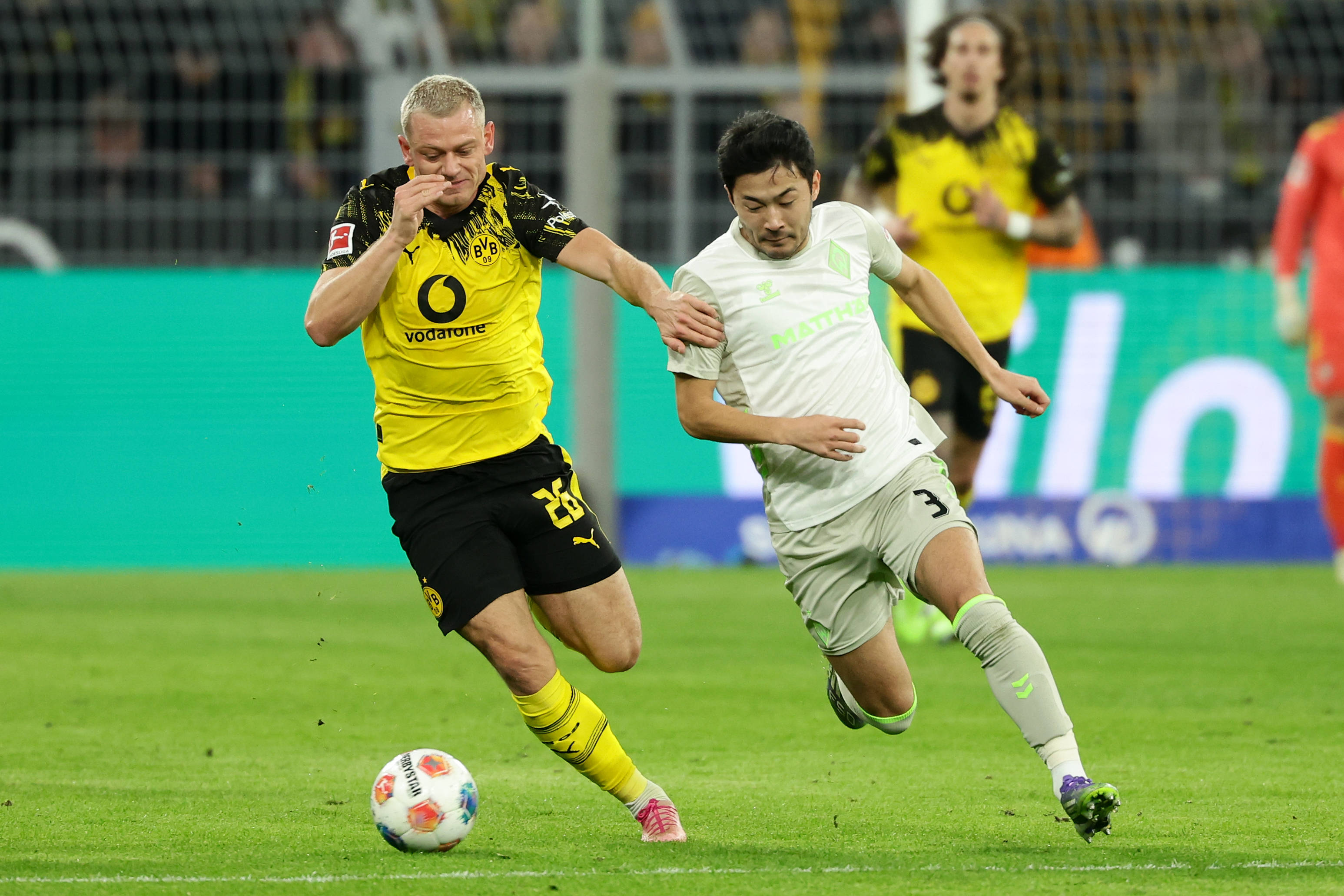 เมื่อวันที่ 13 มกราคม รีลสันของโบรุสเซีย ดอร์ทมุนด์ (ซ้าย) และยูเซอิ สุงาวาระของแวร์เดอร์ เบรเมน แย่งชิงการครองบอลระหว่างการแข่งขัน สำนักข่าวซินหัว (ภาพโดย Joachim Bivarez)