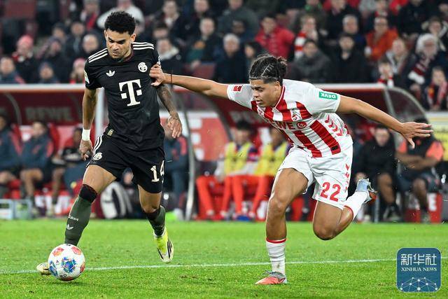 ดิอาซของบาเยิร์น มิวนิก (ขวา) และทิลมันน์ของโคโลญจน์ต่อสู้เพื่อแย่งบอลระหว่างการแข่งขัน