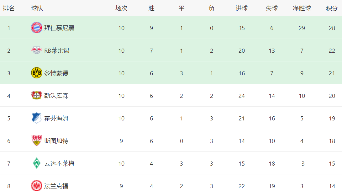ในตารางลีก บาเยิร์น มิวนิค นำเป็นจ่าฝูงด้วยคะแนน 28 คะแนน โดยมีสถิติชนะ 9 นัด และเสมอ 1 นัด – เป็นทีมเดียวในบุนเดสลีกาที่ยังไม่แพ้ใคร. RB ไลป์ซิก อยู่ในอันดับสองด้วยคะแนน 22 คะแนน ตามหลังอยู่ 6 คะแนน.โบรุสเซีย ดอร์ทมุนด์ ครองอันดับสามด้วย 21 คะแนน ไบเออร์ เลเวอร์คูเซ่น ไล่จี้ทีมอันดับบนด้วยชัยชนะที่น่าประทับใจ ขึ้นมาอยู่อันดับสี่ด้วย 20 คะแนน ฮอฟเฟ่นไฮม์ ครองอันดับห้าด้วย 19 คะแนน สตุ๊ตการ์ท ครองอันดับหกด้วย 18 คะแนน