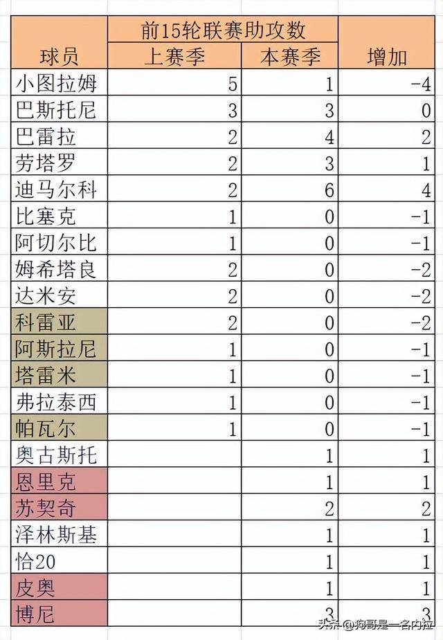 4. ฤดูกาลที่แล้ว มีผู้เล่นทั้งหมด 14 คนที่ทำแอสซิสต์ได้ ขณะที่ฤดูกาลนี้ตัวเลขดังกล่าวลดลงเหลือ 12 คน ในจำนวนนั้น สถิติแอสซิสต์ของดิมาร์โกโดดเด่นเป็นพิเศษด้วยเหตุผลสองประการ:ประการแรก ภายใต้การบริหารของคอนเต้ ดimarco มักถูกเปลี่ยนตัวออกเกือบทุกครั้งภายใน 70 นาที; ในขณะที่ในระบบของซิวโควิช เขาไม่จำเป็นต้องเปลี่ยนตำแหน่งอย่างกว้างขวางอีกต่อไป ความอดทนที่จำกัดของเขาสามารถมุ่งเน้นไปที่จุดแข็งหลักของเขาได้ในตอนนี้ ขณะที่เวลาการเล่นของเขาเพิ่มขึ้นอย่างมีนัยสำคัญ บ่อยครั้งที่เขาสามารถเล่นเต็มเกมได้ประการที่สอง หลังจากที่ดัมฟรีส์ได้รับบาดเจ็บ อินเตอร์ได้กลายเป็นทีมที่พึ่งพาการโจมตีทางฝั่งซ้ายมากเกินไป โดยบางครั้งต้องใช้ลูกตั้งเตะเป็นกลยุทธ์หลัก นี่เป็นหนึ่งในปัญหาที่ซิฟโควิชต้องค่อยๆ แก้ไขในอนาคต