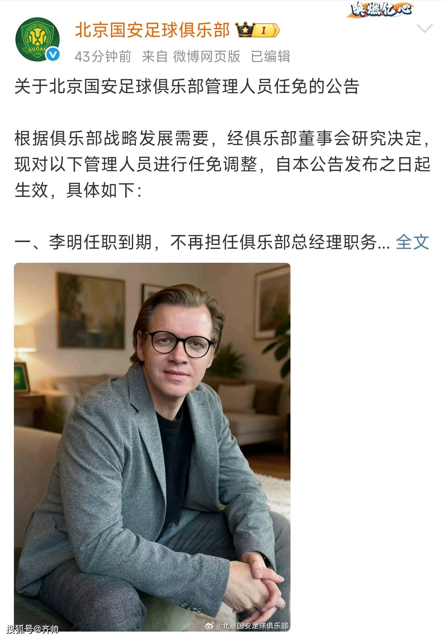 เวลาปักกิ่ง, 27 ธันวาคม 2025. เมื่อปี 2025 ใกล้จะสิ้นสุดลง ฤดูกาลทั้งหมดของทีมปักกิ่ง กั๋วอัน ได้สิ้นสุดลงแล้ว หลังจากที่พวกเขาจบอันดับที่สี่ในลีกสูงสุดของจีน และคว้าแชมป์เอฟเอ คัพ. เวลา 10:00 น. ของเช้าวันนี้ สโมสรได้ประกาศอย่างเป็นทางการว่า หลี่ หมิง จะไม่ดำรงตำแหน่งผู้จัดการทั่วไปอีกต่อไป.