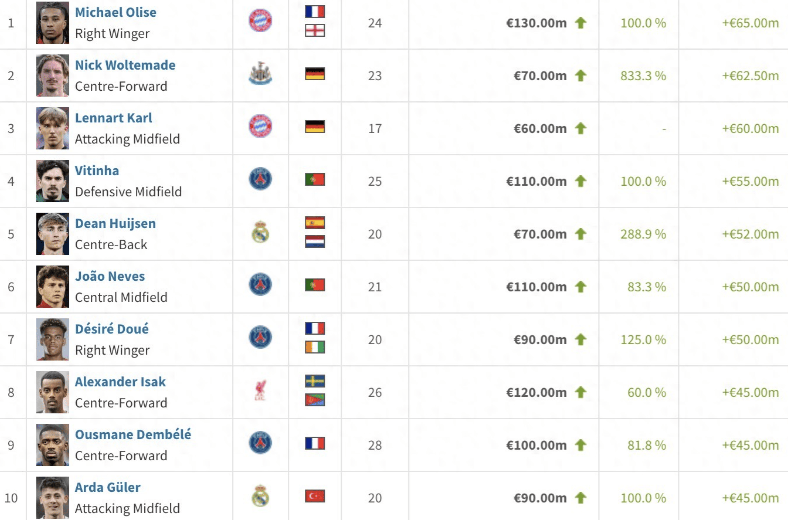 โอริสเซ่ มีมูลค่าตลาดเพิ่มขึ้นถึง 65 ล้านยูโรในช่วงปีที่ผ่านมา – ซึ่งเป็นการเพิ่มขึ้นสูงสุดในวงการฟุตบอล – ขณะนี้มีมูลค่าอยู่ที่ 130 ล้านยูโร อันดับสองคือโวลท์มัด นักฟุตบอลทีมชาติเยอรมนี ซึ่งมูลค่าของเขาเพิ่มขึ้นถึง 62.5 ล้านยูโร จากเพียง 7.5 ล้านยูโรเมื่อปีที่แล้ว และในปัจจุบันมีมูลค่าอยู่ที่ 70 ล้านยูโรในขณะเดียวกัน คาร์ลจากเยอรมนีได้เพิ่มมูลค่าจากศูนย์เป็นมูลค่าปัจจุบันที่ 60 ล้านยูโร