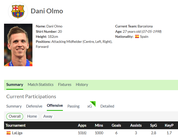 ในฤดูกาลนี้จนถึงปัจจุบัน โอลโมได้ลงเล่นเป็นตัวจริงในลาลีกา 10 นัด และลงเล่นเป็นตัวสำรอง 6 นัด รวมเวลาลงสนามทั้งหมด 1,000 นาที เขาทำประตูได้ 6 ประตู และแอสซิสต์ 3 ครั้ง ซึ่งหมายความว่าเขามีส่วนร่วมในการทำประตูเกือบทุก 110 นาที ซึ่งเป็นอัตราที่มีประสิทธิภาพสูงมาก