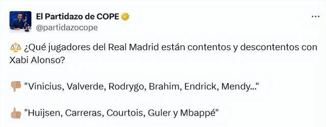 ผู้เล่นคนใดที่สนับสนุนอลอนโซอย่างแน่วแน่ และใครที่เก็บความไม่พอใจไว้? อลาซซ่าได้ระบุชื่อวินิซิอุส, วัลเวอร์เด้, โรดรีโก้, บราฮิม ดิอาซ, เอนดริค และเมนดี้ เป็นผู้ที่แสดงความไม่พอใจกับโค้ช ในขณะที่ไฮเซน, คาร์เรรัส, คูร์ตัว, ชูอาเมนี, กูเลอร์ และเอ็มบัปเป้ ได้แสดงการสนับสนุนอลอนโซอย่างชัดเจน