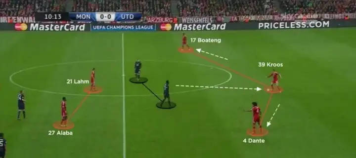 ตัวอย่างเช่น ในฉากที่แสดงข้างต้น ขณะที่ Kroos รับบอล Lahm, Boateng, Alaba และ Dante เริ่มการเคลื่อนไหวโดยไม่มีบอล ในจังหวะนี้ Boateng ค่อยๆ เคลื่อนไปทางปีกขวาของ Kroos ในขณะที่ Dante ยืนตำแหน่งใกล้ๆ เพื่อควบคุมการเล่น เดินไปทางพื้นที่ด้านซ้ายก่อนที่จะสั่งการเพื่อนร่วมทีมเกี่ยวกับการวิ่งที่พวกเขาต้องการ