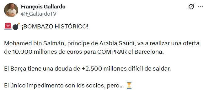 ในช่วงไม่กี่วันที่ผ่านมา มีข่าวใหญ่ที่สร้างความสั่นสะเทือนให้กับวงการฟุตบอล เมื่อสื่อสเปนหลายแห่งที่เชื่อถือได้และนักข่าวอาวุโส กัลยาร์โด ได้ยืนยันว่า บาร์เซโลนา ยักษ์ใหญ่แห่งลาลีกา อาจกำลังเผชิญกับการเปลี่ยนแปลงครั้งใหญ่ที่ไม่เคยเกิดขึ้นมาก่อน โดยรายงานระบุว่า มกุฎราชกุมารแห่งซาอุดีอาระเบีย โมฮัมเหม็ด บิน ซัลมาน กำลังวางแผนที่จะลงทุน 10,000 ล้านยูโรเพื่อเข้าซื้อกิจการสโมสรที่มีประวัติศาสตร์ยาวนานกว่าร้อยปี หากดีลนี้เกิดขึ้นจริง จะเป็นการเปิดหน้าประวัติศาสตร์ใหม่ของวงการฟุตบอล
