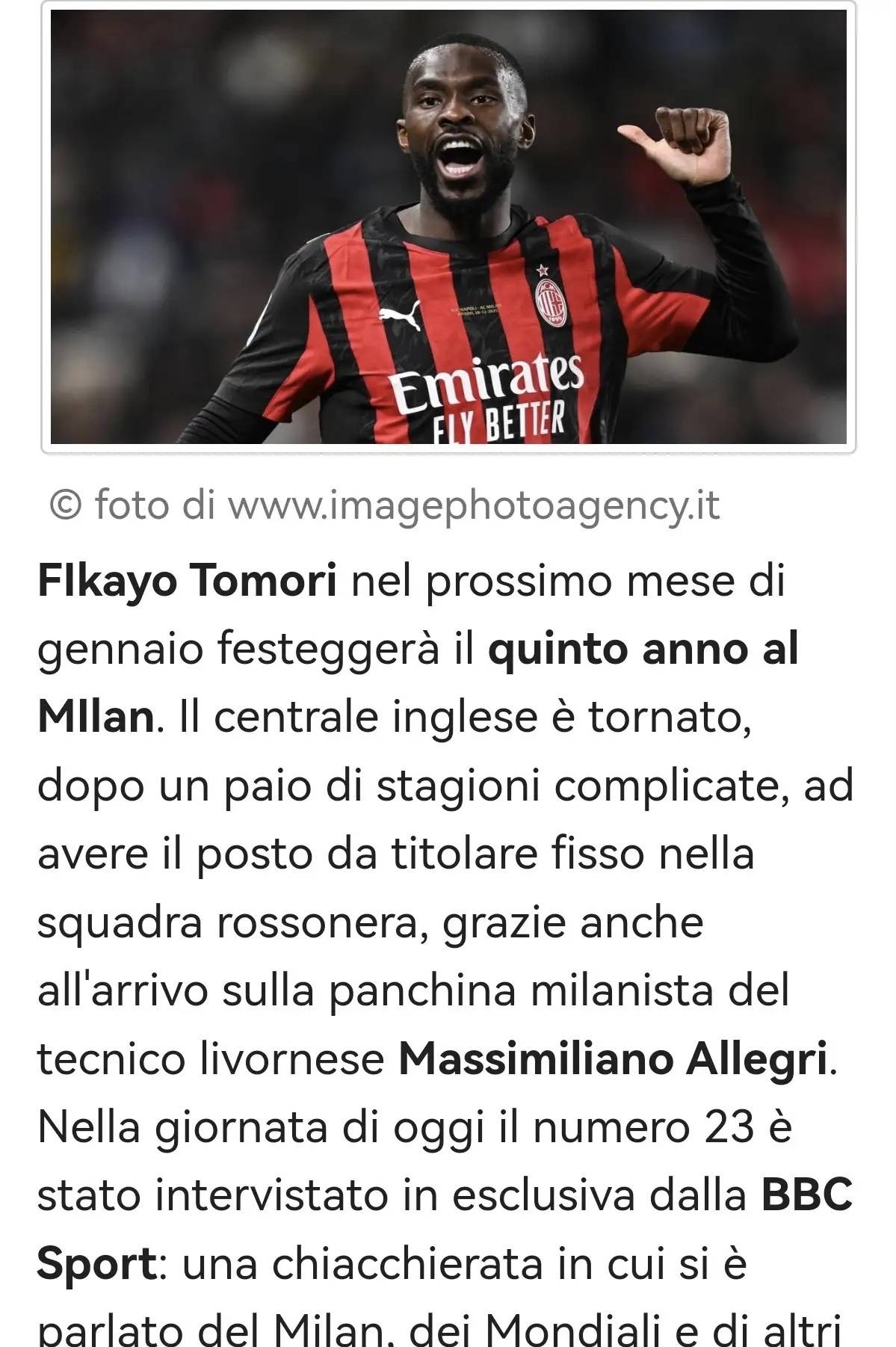 ฟิกาโย โทโมริ จะครบรอบห้าปีนับตั้งแต่เข้าร่วมทีมเอซี มิลานในเดือนมกราคมที่จะถึงนี้ หลังจากผ่านฤดูกาลที่ท้าทายมาหลายฤดูกาล กองหลังชาวอังกฤษได้กลับมาเป็นผู้เล่นตัวจริงให้กับรอสโซเนรีอีกครั้ง ส่วนใหญ่เป็นเพราะการมาของมัสซิมิเลียโน อัลเลกรี วันนี้ หมายเลข 23 ได้ให้สัมภาษณ์พิเศษกับ BBC Sport โดยพูดคุยเกี่ยวกับมิลาน, ฟุตบอลโลก และเรื่องส่วนตัวอื่นๆ ในระหว่างการสนทนา: