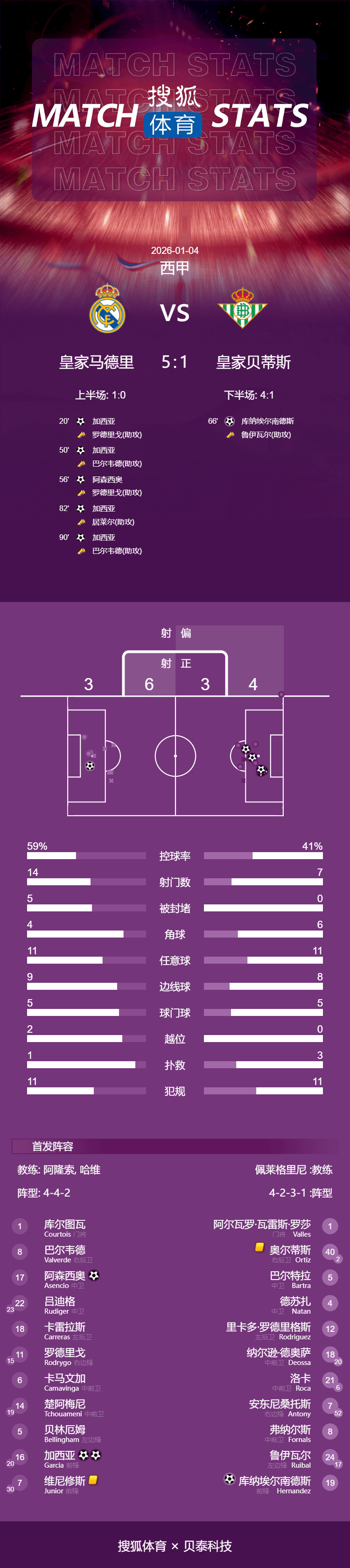 เวลา 23:15 น. ของวันที่ 4 มกราคม 2026 การแข่งขันนัดสำคัญในรอบที่ 18 ของฤดูกาลลาลีกา 2025-2026 ได้เริ่มต้นขึ้น โดยเรอัล มาดริดเปิดบ้านต้อนรับการมาเยือนของเรอัล เบติส ในครึ่งแรก โรดรีโก้ทำแอสซิสต์ให้กอนซาโล การ์เซียยิงประตูขึ้นนำในครึ่งหลัง กอนซาโล การ์เซีย ยิงประตูด้วยการจบสกอร์อย่างเฉียบขาดหลังจากรับบอลจากเฟเดริโก บัลเบร์เด ราอูล อาเซนซิโอ ทำประตูจากลูกเตะมุมที่โรดรีโก้เปิดเข้ามา คุโช่ ชาคอน ทำประตูตีตื้นให้เบติสหลังจากเลี้ยงบอลผ่านติโบต์ กูร์ตัวกูลเลอร์ส่งบอลให้กอนซาโล การ์เซีย ซึ่งทำแฮตทริกสำเร็จด้วยการยิงด้วยส้นเท้า ในเวลาทดเจ็บ บัลเบร์เด้ช่วยแฟรน การ์เซียทำประตูที่ห้า เรอัล มาดริดเอาชนะเบติสอย่างสบาย 5-1 ในบ้าน ขยายสถิติชนะติดต่อกันเป็นสี่นัดในทุกการแข่งขัน และยังคงรักษาช่องว่างสี่คะแนนตามหลังบาร์เซโลนา