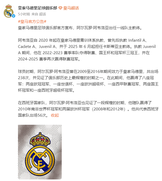 ในช่วงเช้าตรู่ของวันที่ 13 มกราคม ตามเวลาปักกิ่ง สโมสรเรอัล มาดริด ได้ประกาศผ่านเว็บไซต์อย่างเป็นทางการว่า ชาบี อลอนโซ่ ผู้จัดการทีมชุดใหญ่ได้ลาออกจากตำแหน่งอย่างเป็นทางการแล้ว โดย อัลบาโร่ อาร์เบลัว ได้รับการแต่งตั้งเป็นผู้จัดการทีมชุดใหญ่คนใหม่ ในการแข่งขันรอบชิงชนะเลิศศึกซูเปอร์คัพสเปนที่เพิ่งจบลง เรอัล มาดริด พ่ายแพ้ให้กับบาร์เซโลน่า 2-3 ทำให้พลาดแชมป์ไปอย่างน่าเสียดาย