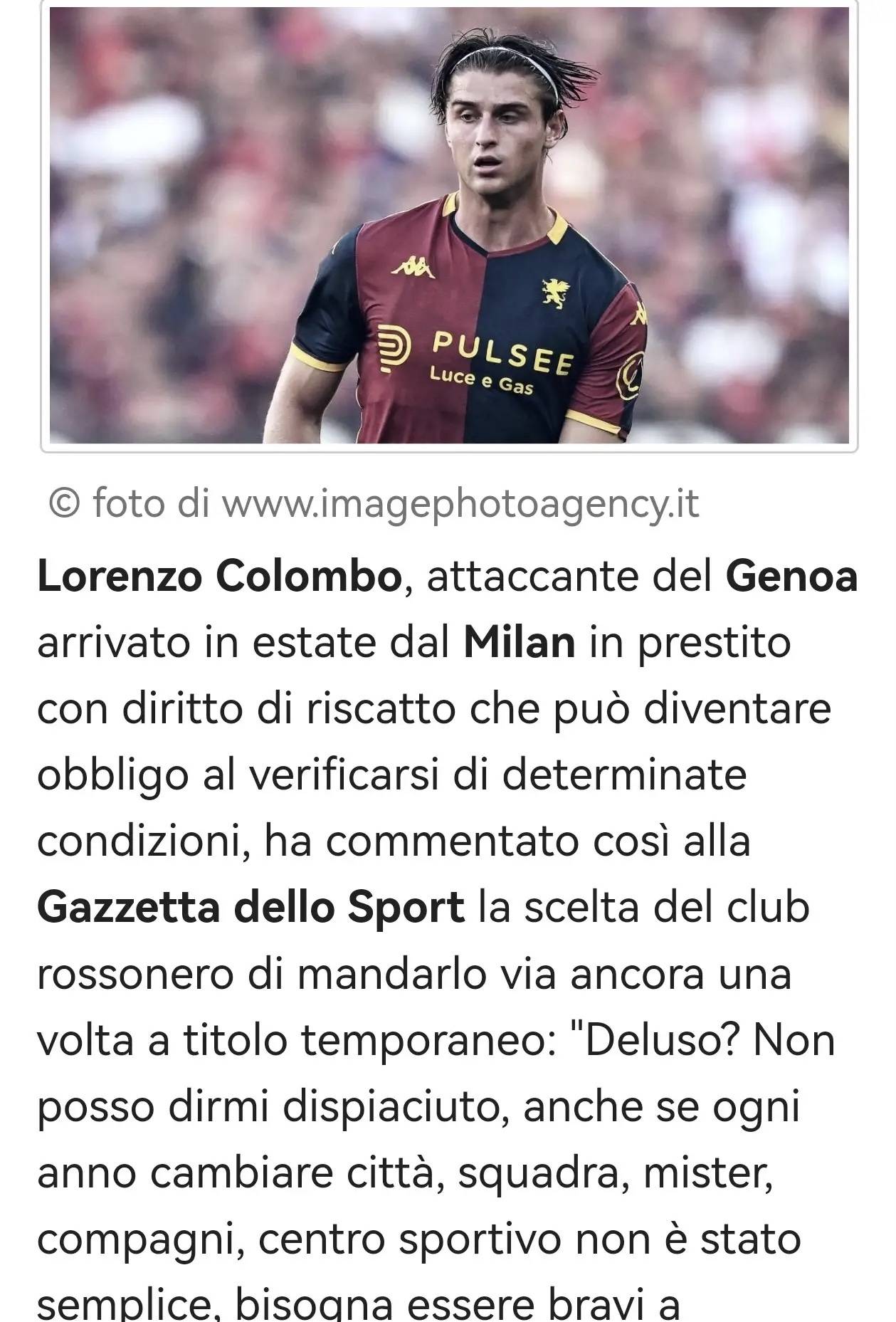 โคลอมโบ กองหน้าของเจนัว กล่าวในการให้สัมภาษณ์ว่า: "การกลับไปมิลานคือเป้าหมายสูงสุดของผม ตอนนี้ผมต้องมุ่งมั่นทำผลงานให้ดีในทุกนัดที่นี่"
