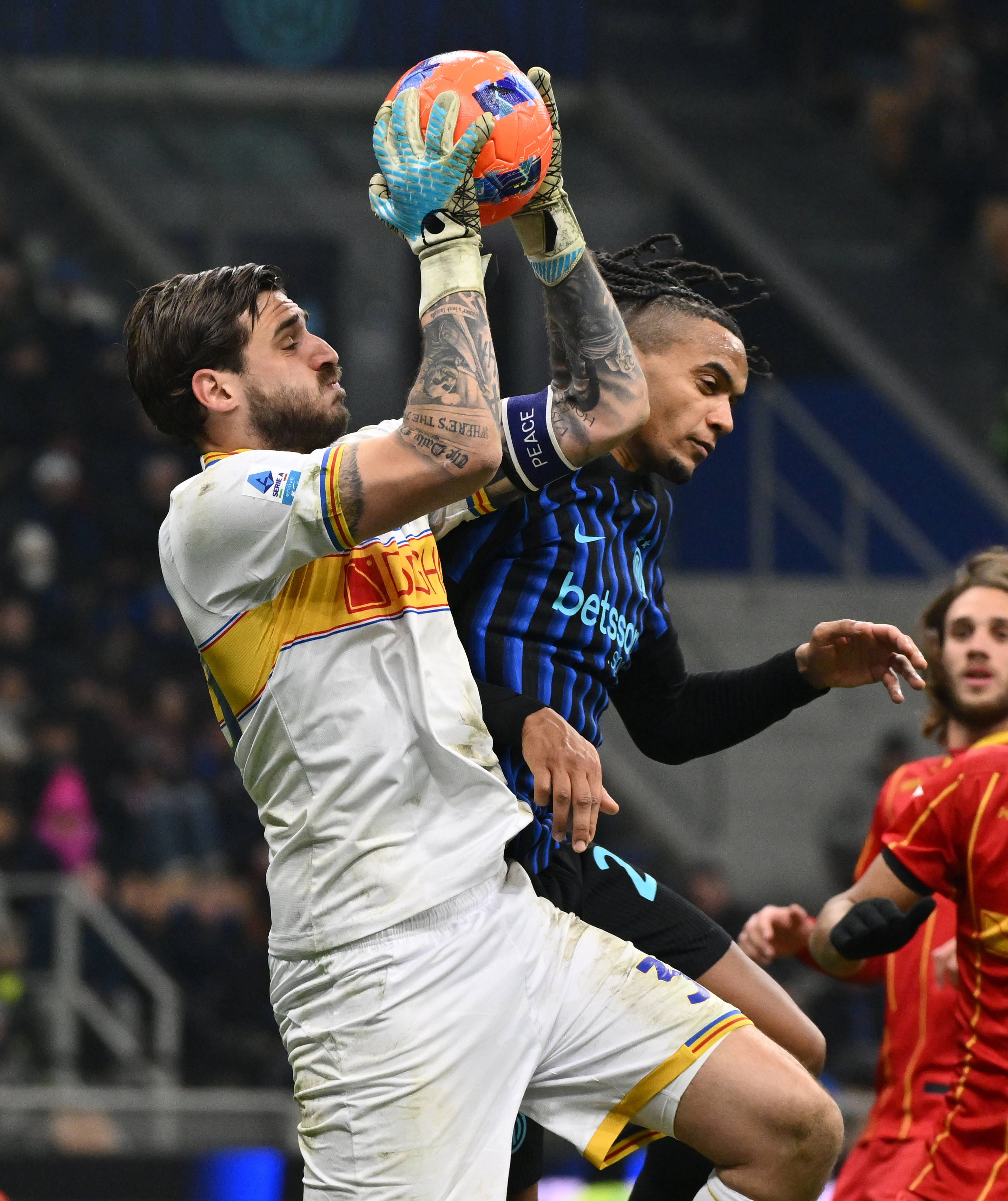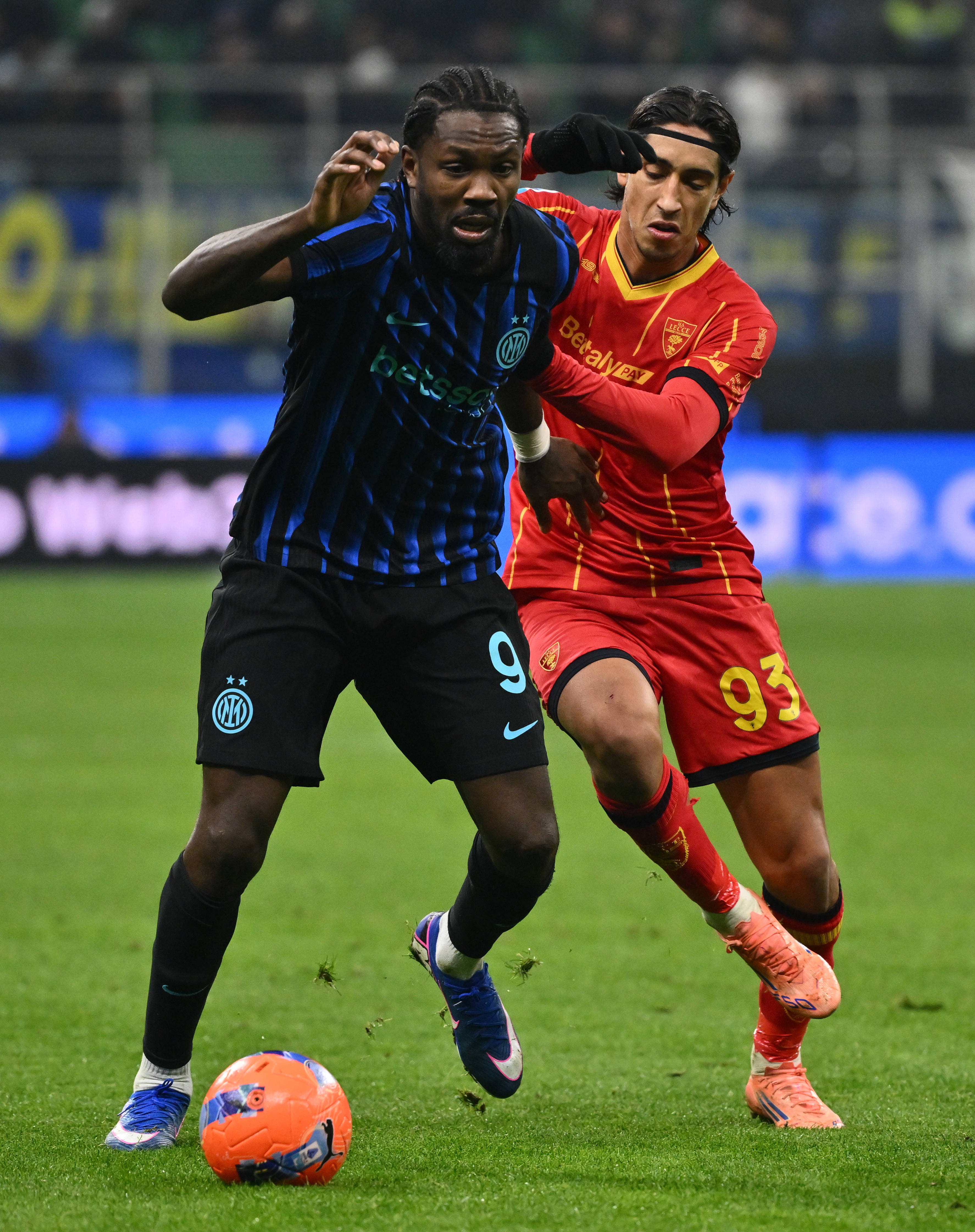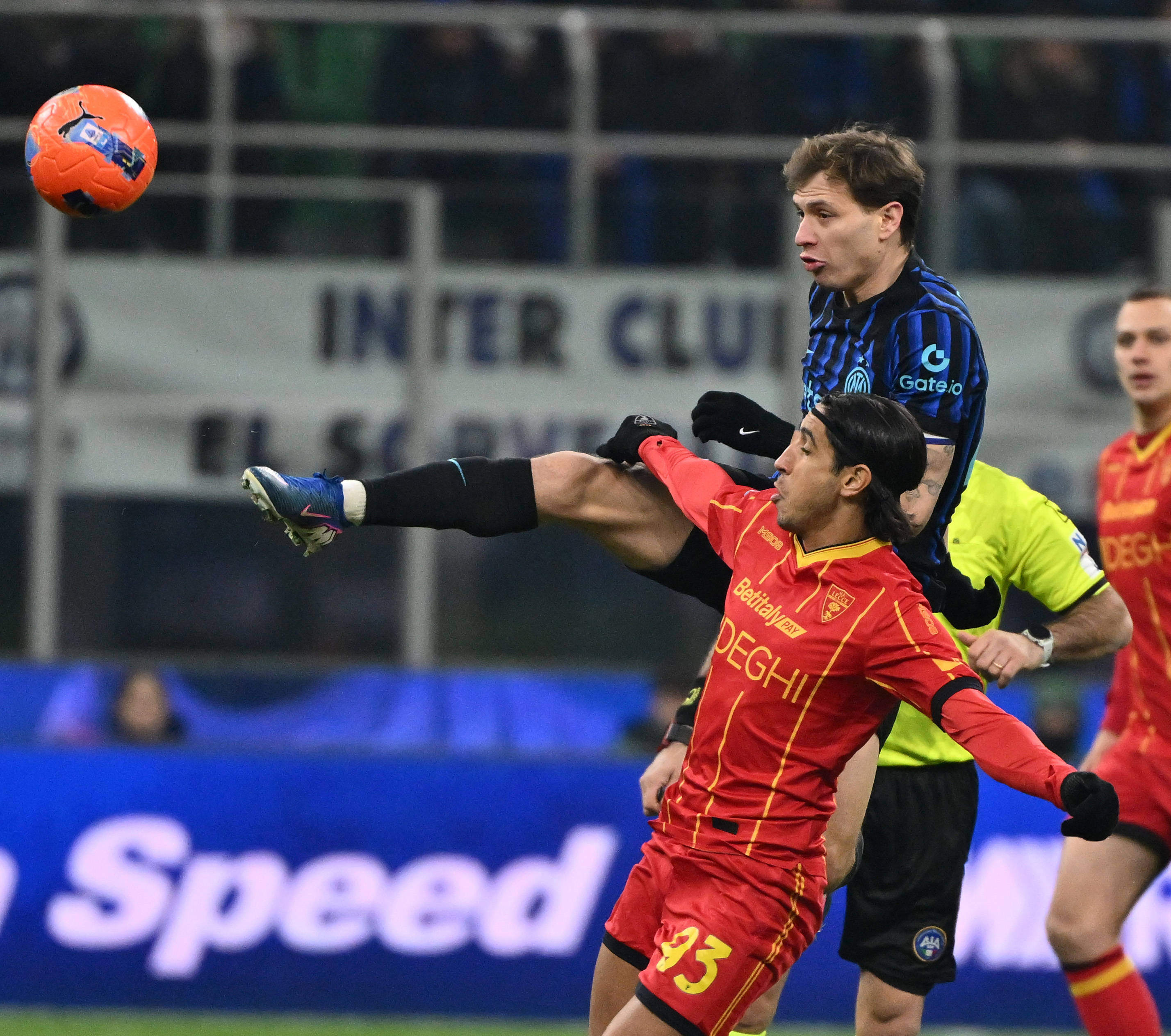 เมื่อวันที่ 14 มกราคม บารェลล่า ของอินเตอร์ มิลาน (บน) ท้าทาย มาเล็ค ของเลชเช่ ระหว่างการแข่งขัน. สำนักข่าวซินหัว (ภาพโดย อัลเบร์โต้ ลิงเกีย)