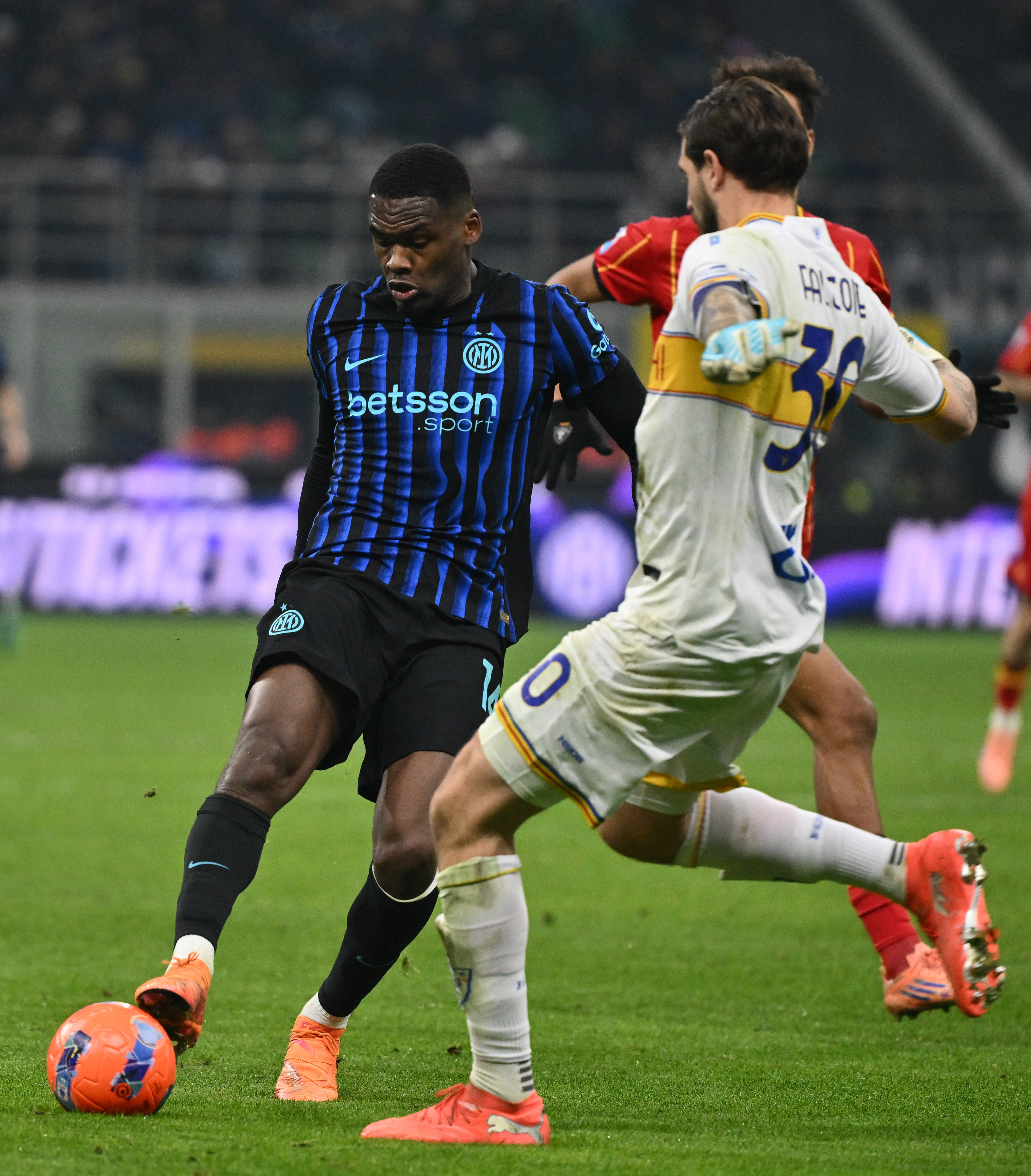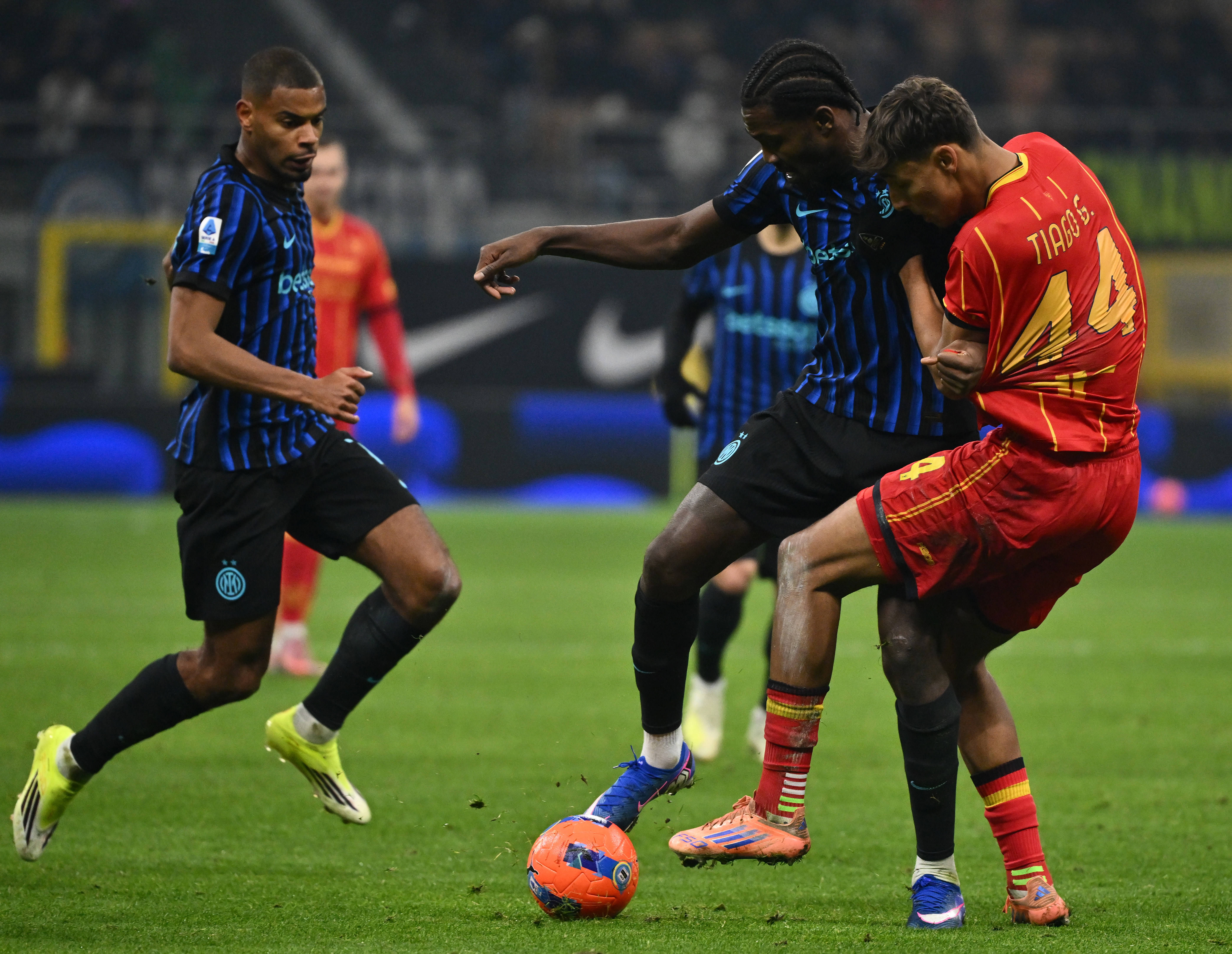เมื่อวันที่ 14 มกราคม ลิเลียน ทูราม (กลาง) ของอินเตอร์ มิลาน กำลังท้าทาย กาเบรียล (ขวา) ของเลชเช่ ระหว่างการแข่งขัน สำนักข่าวซินหัว (ภาพโดย อัลแบร์โต ลิงเกีย)