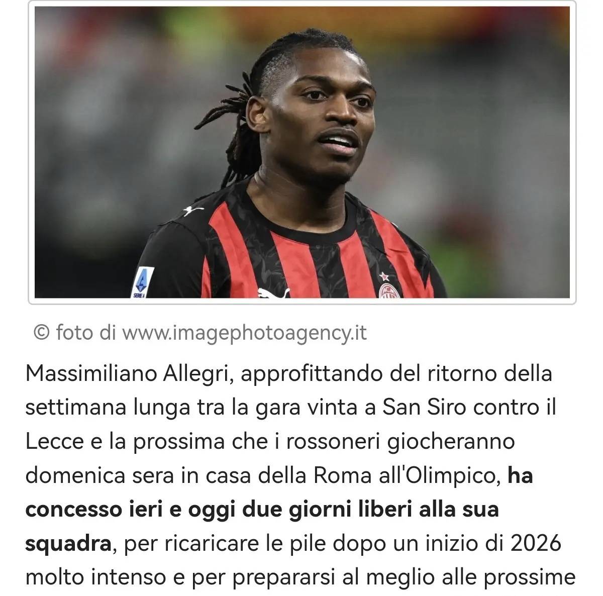 อย่างไรก็ตาม ตามรายงานของ Luca Bianchini นักข่าวจาก Gazzetta dello Sport วันนี้ แม้ว่าจะเป็นวันพัก แต่ Rafael Leão ได้เดินทางไปยังสนามฝึกซ้อม Milanello ด้วยตัวเองพร้อมกับผู้เล่นที่บาดเจ็บซึ่งกำลังฟื้นฟูร่างกาย เขาเป็นผู้เล่นเพียงคนเดียวที่ฟิตสมบูรณ์และมาที่ศูนย์กีฬา Carnago โดยสมัครใจ