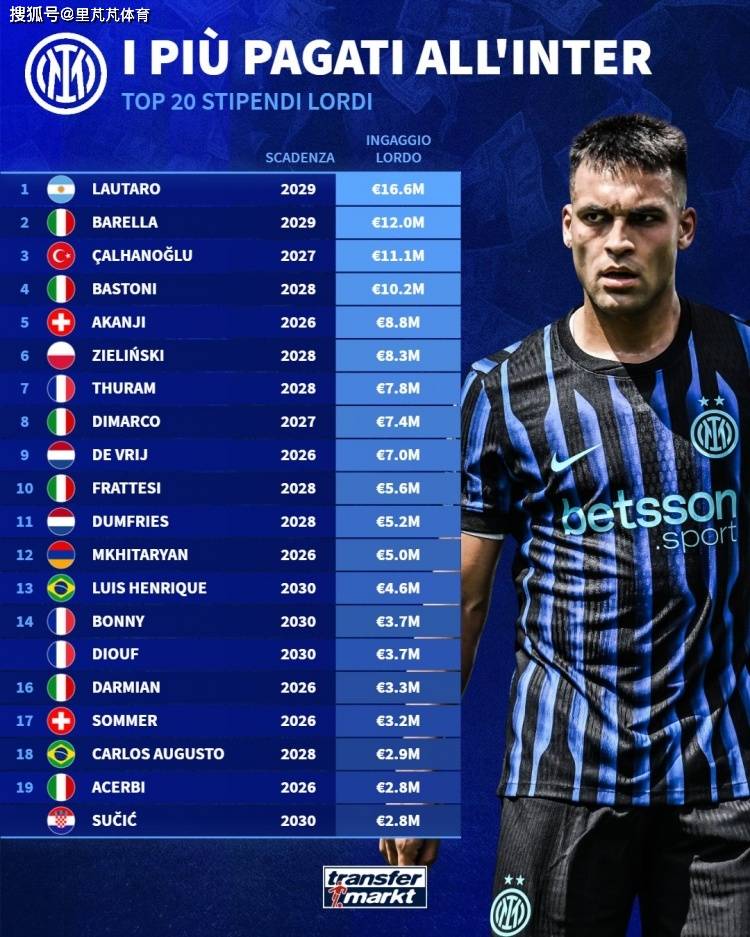 Transfermarkt ได้รวบรวมรายชื่อนักเตะของอินเตอร์ มิลาน พร้อมค่าเหนื่อยก่อนหักภาษีประจำปี โดยลัตาโร่เป็นผู้นำด้วยจำนวน 16.6 ล้านยูโร ตามมาด้วยบารелล่าและชัลฮาโนกลูในอันดับสองและสามตามลำดับ