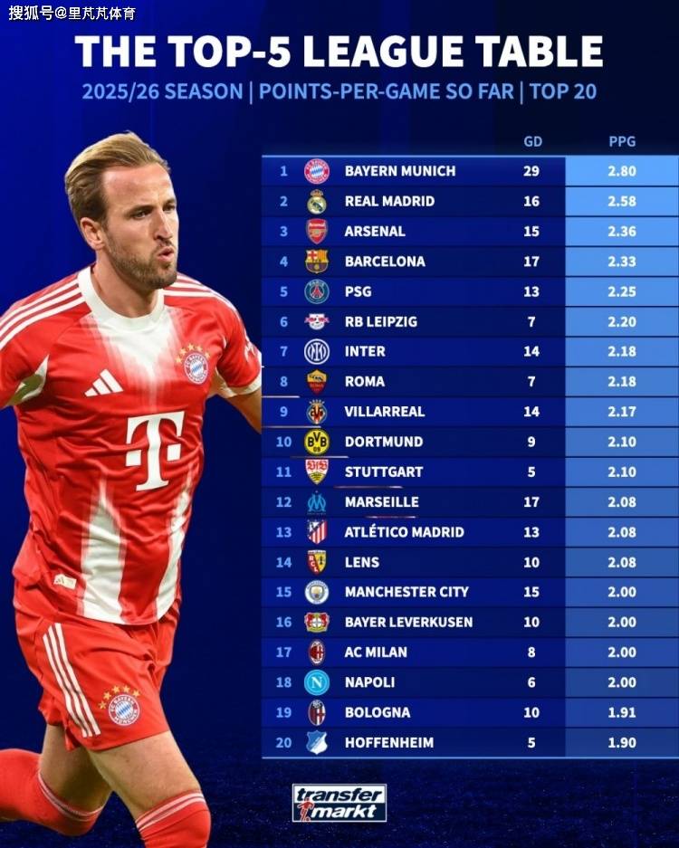 ลีกชั้นนำ 5 อันดับแรกของยุโรปกำลังจะกลับมาแข่งขันอีกครั้ง และ Transfermarkt ได้รวบรวมสถิติเกี่ยวกับคะแนนเฉลี่ยต่อเกมที่ทีมต่างๆ ในลีกเหล่านี้ทำได้ในฤดูกาลนี้ โดยบาเยิร์น มิวนิคเป็นผู้นำ
