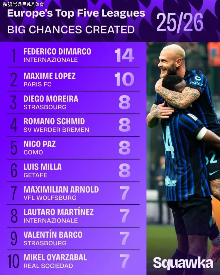 Squawka ได้รวบรวมสถิติเกี่ยวกับจำนวนโอกาสที่ชัดเจนที่สร้างขึ้นโดยผู้เล่นในลีกชั้นนำ 5 ลีกของยุโรปในฤดูกาลนี้ โดย Dimarco อยู่ในอันดับสูงสุดด้วยการสร้างโอกาสดังกล่าวถึง 14 ครั้ง