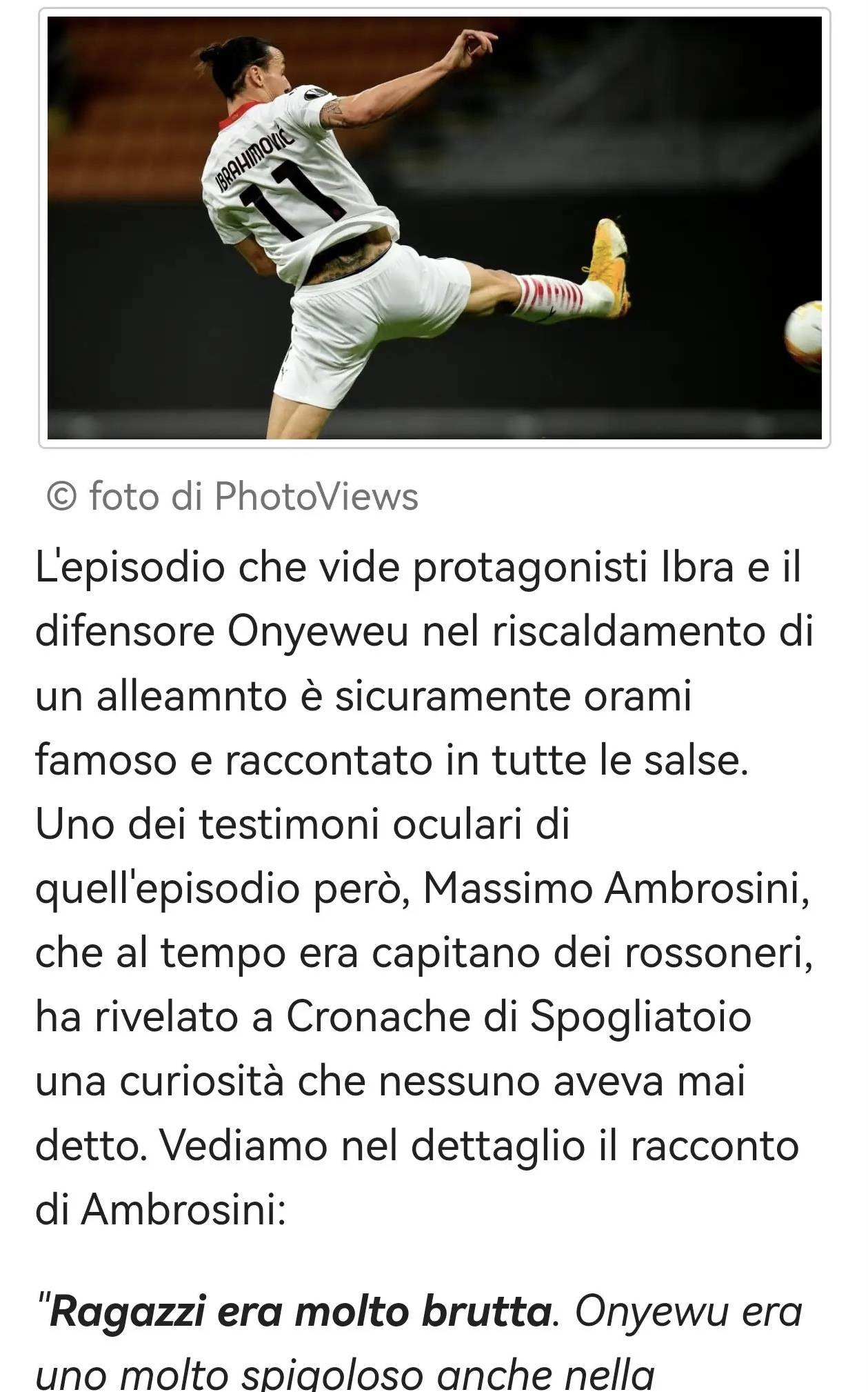 อดีตกัปตันทีมมิลาน มัสซิโม อัมโบรซินี เปิดเผยกับ The Changing Room Chronicles ถึงรายละเอียดของเหตุการณ์ปะทะกันระหว่างซลาตัน อิบราฮิโมวิช และกองหลัง โอนเยอูวู ระหว่างการวอร์มอัพก่อนฝึกซ้อม แม้ว่าเหตุการณ์นี้จะเป็นที่รู้จักกันอย่างกว้างขวาง แต่ยังมีสถานการณ์ที่ยังไม่เปิดเผย: