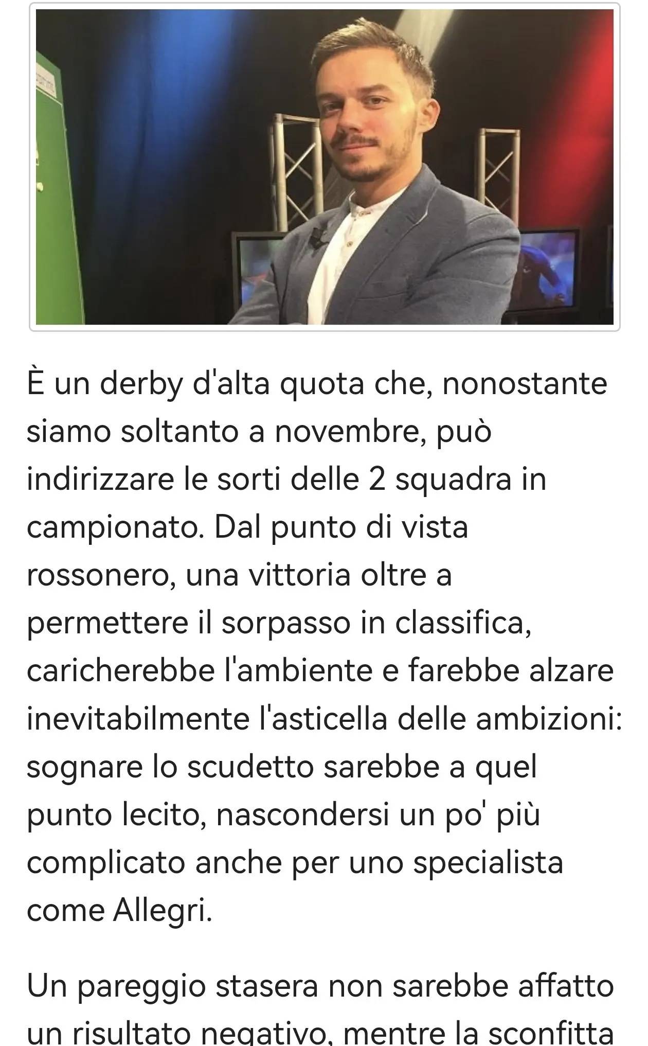 การเสมอไม่ใช่ผลลัพธ์เชิงลบ แต่การพ่ายแพ้จะส่งผลกระทบอย่างรุนแรงต่ออันดับ, เป้าหมาย และขวัญกำลังใจของทีม: ปัจจุบันตามหลังอินเตอร์อยู่สองคะแนน หากแพ้ให้กับคู่ปรับร่วมเมืองจะเป็นการสร้างความเสียหายทางจิตใจอย่างหลีกเลี่ยงไม่ได้ ซึ่งยิ่งทวีความรุนแรงขึ้นจากแรงกดดันที่เกิดจากการเสียสองคะแนนในเกมเสมอกับปาร์มาเมื่อก่อนหน้านี้ ในทางกลับกัน อินเตอร์ไม่ชนะในห้าเกมดาร์บี้ล่าสุด โดยแพ้สามครั้งและเสมอสองครั้ง ซึ่งบ่งชี้ว่าพวกเขาอาจมีข้อจำกัดทางจิตใจเมื่อต้องเผชิญหน้ากับมิลาน