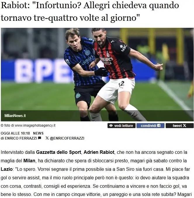 ราบิโอต์! ในการให้สัมภาษณ์ ราบิโอต์เปิดเผยว่าในช่วงที่เขาต้องพักรักษาอาการบาดเจ็บ อัลเลกรีจะเข้ามาตรวจสอบทุกสองหรือสามวันเพื่อดูว่าเขาพร้อมที่จะกลับมาหรือไม่ อย่างไรก็ตาม ผู้จัดการทีมต้องการให้เขาลงเล่นเฉพาะเมื่อพร้อมอย่างเต็มที่เท่านั้น แต่คุณยังสามารถสัมผัสได้ถึงความกระตือรือร้นของอัลเลกรีฉันแทบจะจินตนาการภาพนั้นออกเลย—สีหน้าของอัลเลกรีที่แสดงออกคู่กับน้ำเสียงที่อ่อนโยนนั้น จริงๆ แล้วมันยากที่จะปฏิเสธ พูดตามตรง แฟนบอลมิลานทุกคนก็ถามคำถามเดียวกัน: เมื่อไหร่คุณถึงจะกลับมาฟิตอีกครั้ง? เราคิดถึงคุณในเสื้อทีมมิลานจริงๆ