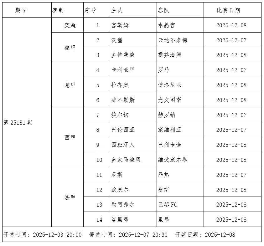 การแข่งขันฟุตบอลแบบชนะ-เสมอ-แพ้ และแบบเลือก 9 คู่ใดก็ได้ ฉบับที่ 25181 นี้ เป็นช่วงเวลาที่มีการแจกรางวัลพิเศษ ขอแนะนำให้ผู้สนใจเข้าร่วมอย่างมีความรับผิดชอบ รอบนี้ประกอบด้วยการแข่งขันจาก 5 ลีกชั้นนำของยุโรป ได้แก่ อังกฤษ เยอรมนี อิตาลี สเปน และฝรั่งเศส ไฮไลท์สำคัญคือการพบกันระหว่างนาโปลีและยูเวนตุสในศึกกัลโช่ เซเรีย อา ขณะที่เรอัล มาดริด ซึ่งเสียตำแหน่งจ่าฝูงลาลีกาไปแล้ว จะเปิดบ้านต้อนรับเซลต้า บีโก้