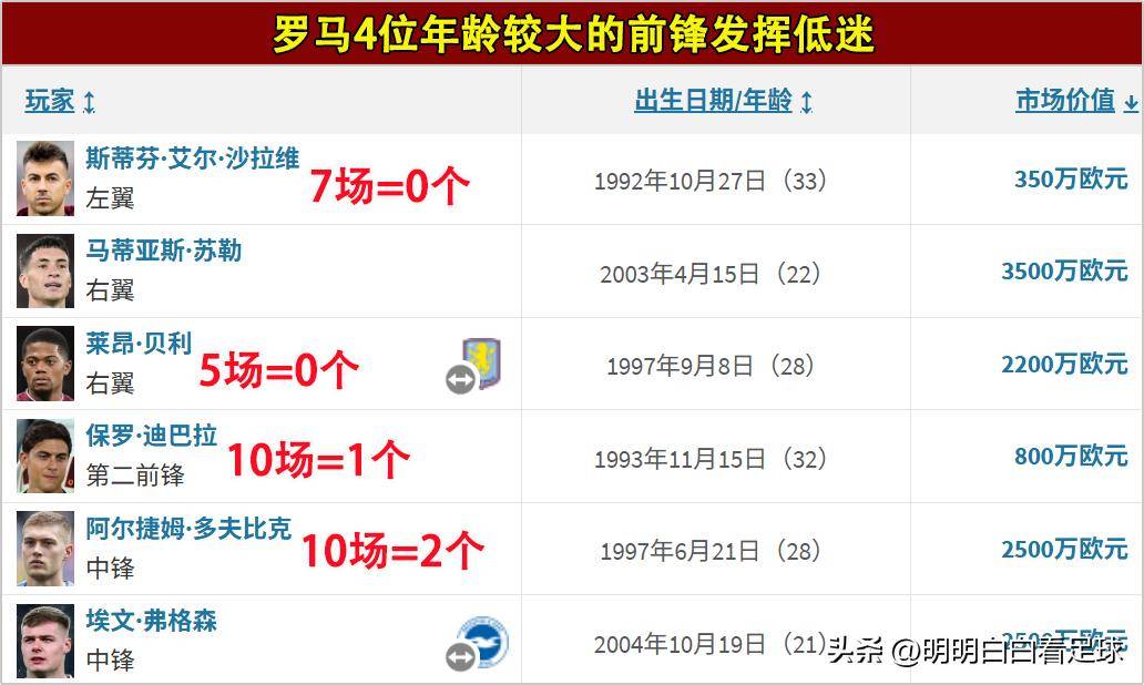 ดังนั้นเราจึงสังเกตได้ว่าในบรรดากองหน้าหกคนของโรมา มีสี่คนที่อายุ 28 ปีขึ้นไป โดยรวมแล้วพวกเขาได้ลงเล่นในเซเรียอา 32 นัด แต่ทำได้เพียงสามประตูเท่านั้น ซึ่งเป็นจำนวนที่น้อยมาก