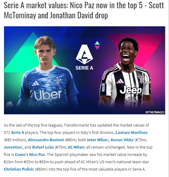 นิโค พัสส์ นักเตะดาวรุ่งวัย 21 ปีของโคโม มีมูลค่าเพิ่มขึ้น 10 ล้านยูโร เป็น 65 ล้านยูโร ทำให้เขาอยู่ในอันดับที่ห้าของตารางโดยรวม ที่น่าสนใจคือ เรอัล มาดริด มีเงื่อนไขการซื้อคืนแบบเอกสิทธิ์สำหรับนักเตะรายนี้ และตั้งใจจะใช้เงื่อนไขดังกล่าวในช่วงฤดูร้อนปี 2026