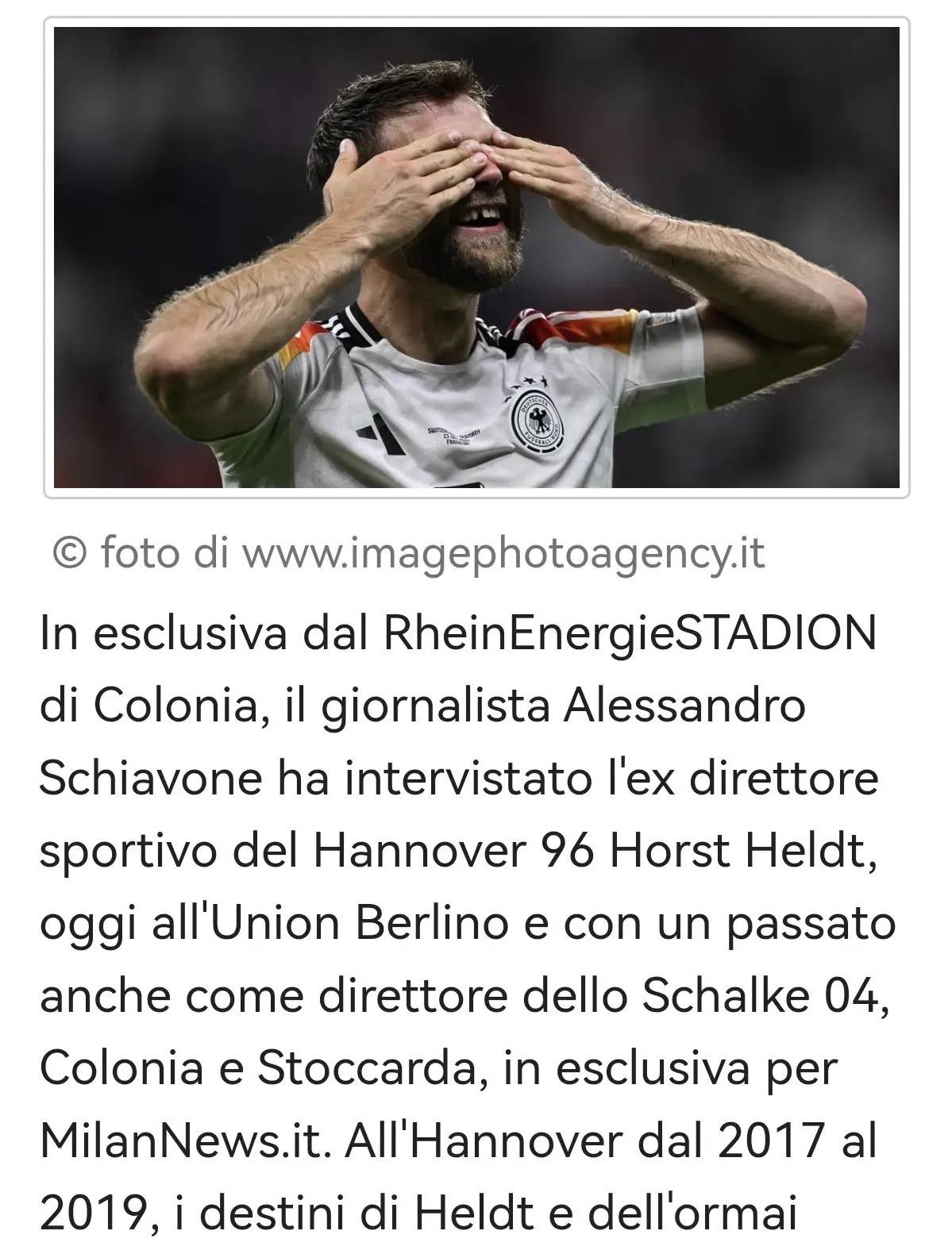 ในการสัมภาษณ์พิเศษที่สนาม RheinEnergie ในเมืองโคโลญ นักข่าว Alessandro Schiavone ได้พูดคุยกับอดีตผู้อำนวยการกีฬาของ Hannover 96 Horst Heldt (ปัจจุบันอยู่ที่ Union Berlin โดยก่อนหน้านี้เคยดำรงตำแหน่งผู้อำนวยการที่ Schalke 04, Cologne และ Stuttgart) การสัมภาษณ์นี้นำเสนอโดย Milan News เท่านั้น