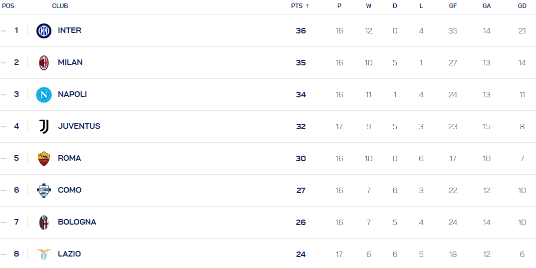 ยูเวนตุสคว้าชัยชนะ 2-0 ในเกมเยือนเหนือปิส่า ซึ่งปัจจุบันอยู่อันดับสี่ด้วยคะแนน 32 คะแนน โรม่า ซึ่งปัจจุบันอยู่อันดับห้า ยังไม่ได้ลงเล่นในรอบนี้ หากโรม่าเอาชนะเจนัวได้ พวกเขาจะแซงยูเวนตุสด้วยคะแนน 33 คะแนน นอกจากนี้ ตารางคะแนนเซเรียอาจะมีความน่าสนใจมากขึ้น โดยทีมอันดับ 1-5 จะห่างกันเพียง 1 คะแนนเท่านั้น